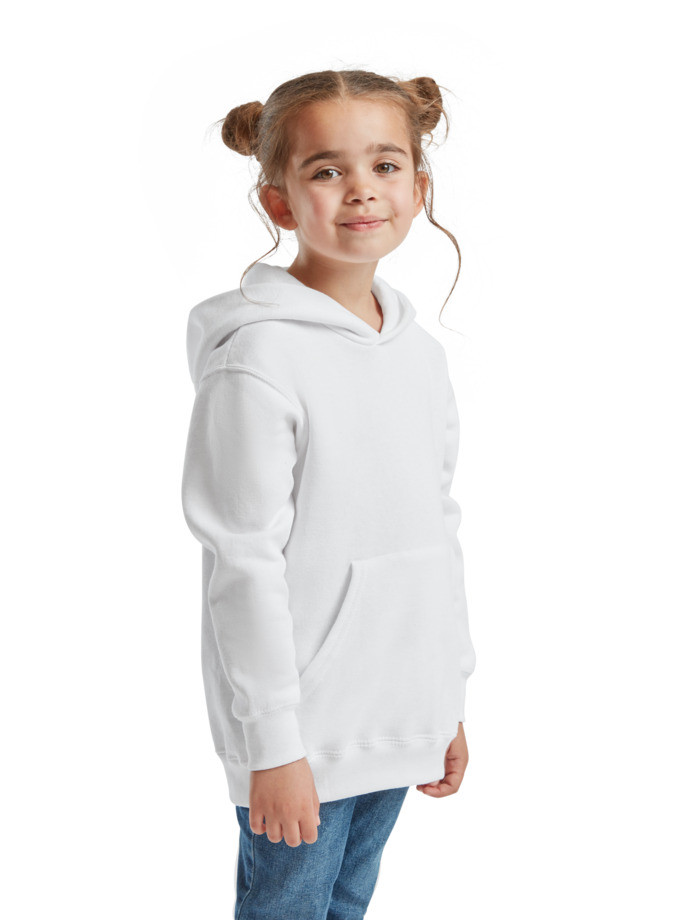 Kapucnis pamut/Lycra® anyagú gyerek pulóver dupla anyagú kapucnival összehúzó nélkül, európai gyerekméretezésnek megfelelő. Első kenguruzseb, bordázott derékrész és ujjvég. Tisztább és tartósabb emblémázhatóság érdekében a gyártó Belcoro® fonalat has