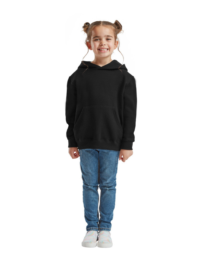 Kapucnis pamut/Lycra® anyagú gyerek pulóver dupla anyagú kapucnival összehúzó nélkül, európai gyerekméretezésnek megfelelő. Első kenguruzseb, bordázott derékrész és ujjvég. Tisztább és tartósabb emblémázhatóság érdekében a gyártó Belcoro® fonalat has