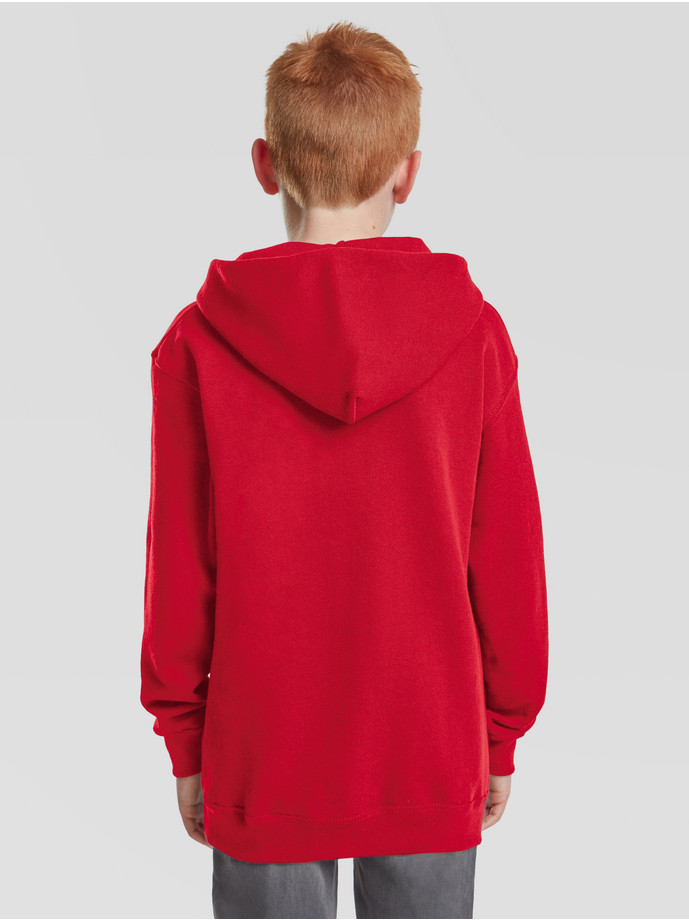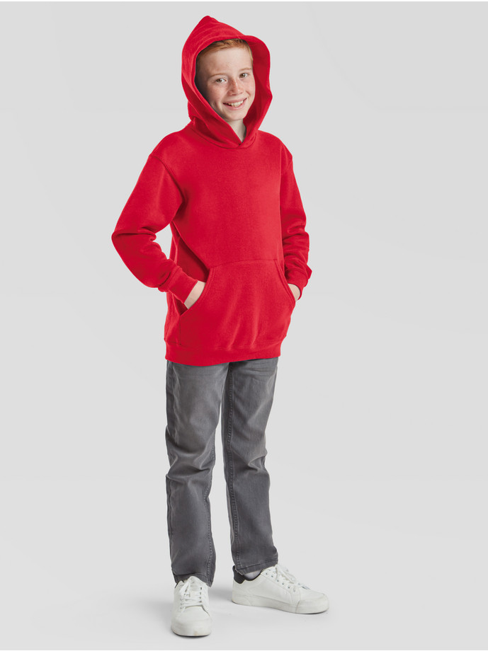 Kapucnis pamut/Lycra® anyagú gyerek pulóver dupla anyagú kapucnival összehúzó nélkül, európai gyerekméretezésnek megfelelő. Első kenguruzseb, bordázott derékrész és ujjvég. Tisztább és tartósabb emblémázhatóság érdekében a gyártó Belcoro® fonalat has