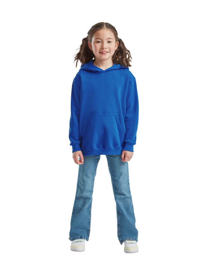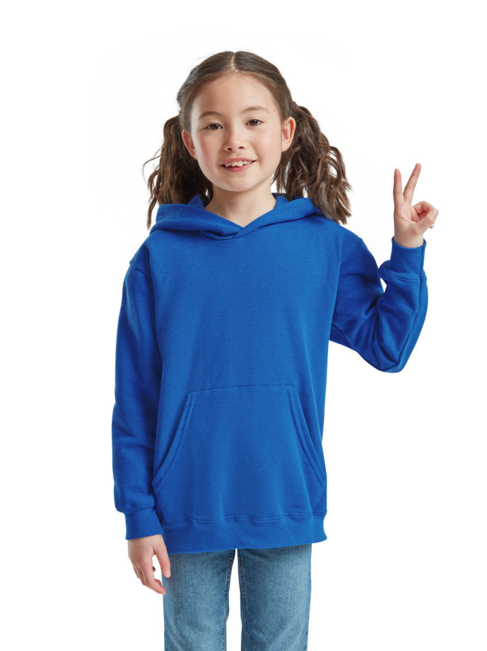 Kapucnis pamut/Lycra® anyagú gyerek pulóver dupla anyagú kapucnival összehúzó nélkül, európai gyerekméretezésnek megfelelő. Első kenguruzseb, bordázott derékrész és ujjvég. Tisztább és tartósabb emblémázhatóság érdekében a gyártó Belcoro® fonalat has