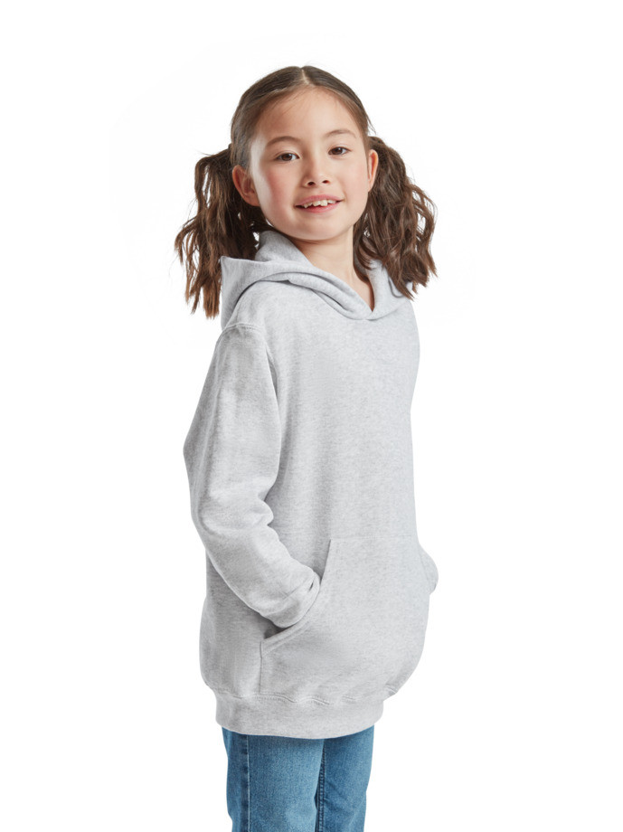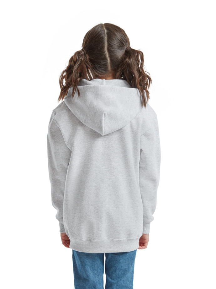 Kapucnis pamut/Lycra® anyagú gyerek pulóver dupla anyagú kapucnival összehúzó nélkül, európai gyerekméretezésnek megfelelő. Első kenguruzseb, bordázott derékrész és ujjvég. Tisztább és tartósabb emblémázhatóság érdekében a gyártó Belcoro® fonalat has
