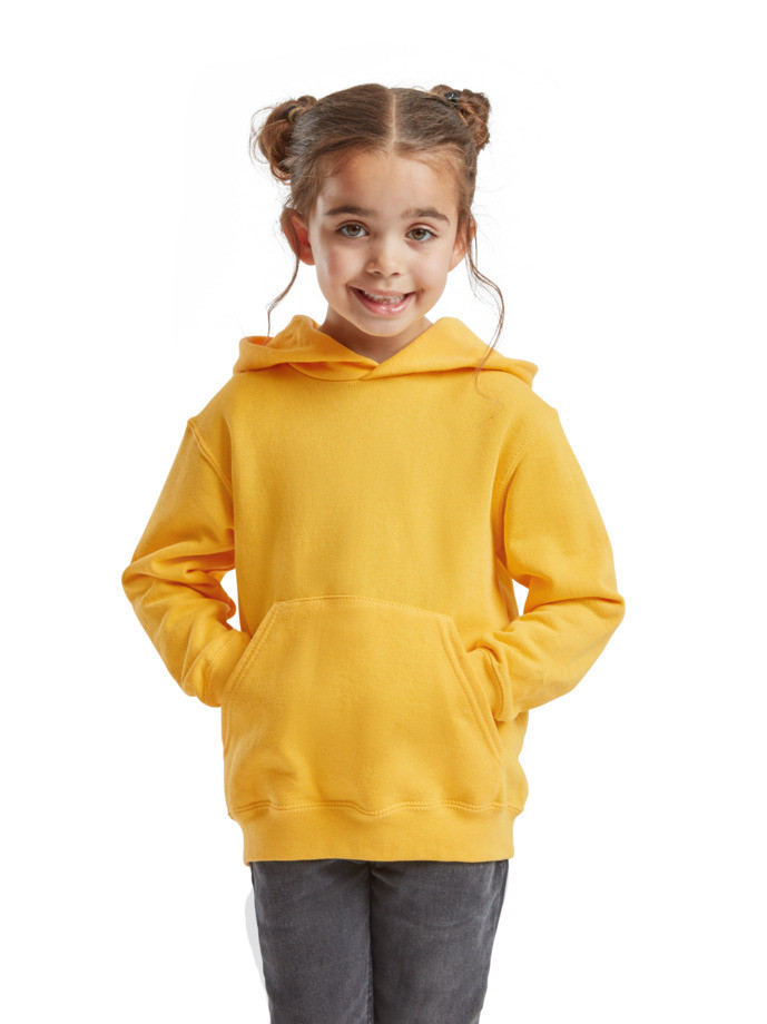 Kapucnis pamut/Lycra® anyagú gyerek pulóver dupla anyagú kapucnival összehúzó nélkül, európai gyerekméretezésnek megfelelő. Első kenguruzseb, bordázott derékrész és ujjvég. Tisztább és tartósabb emblémázhatóság érdekében a gyártó Belcoro® fonalat has