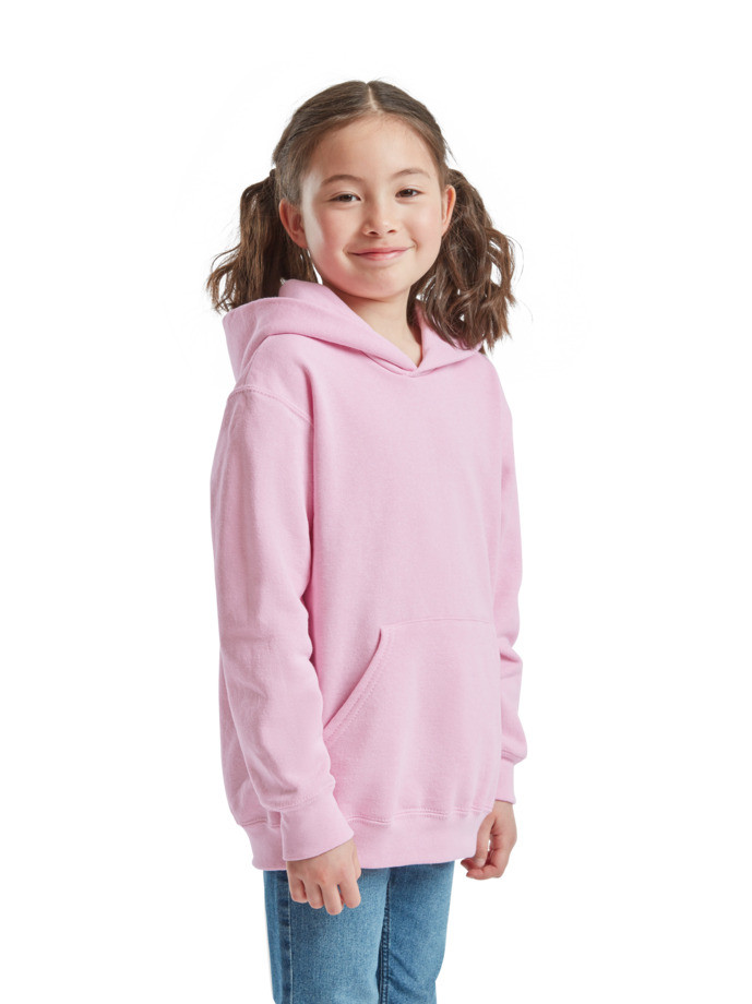 Kapucnis pamut/Lycra® anyagú gyerek pulóver dupla anyagú kapucnival összehúzó nélkül, európai gyerekméretezésnek megfelelő. Első kenguruzseb, bordázott derékrész és ujjvég. Tisztább és tartósabb emblémázhatóság érdekében a gyártó Belcoro® fonalat has
