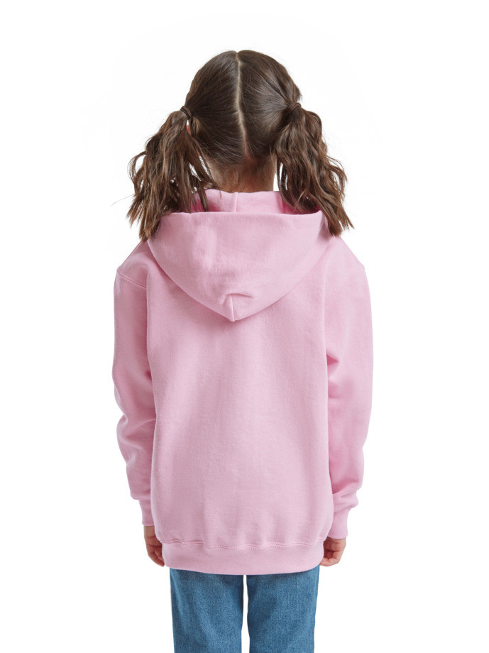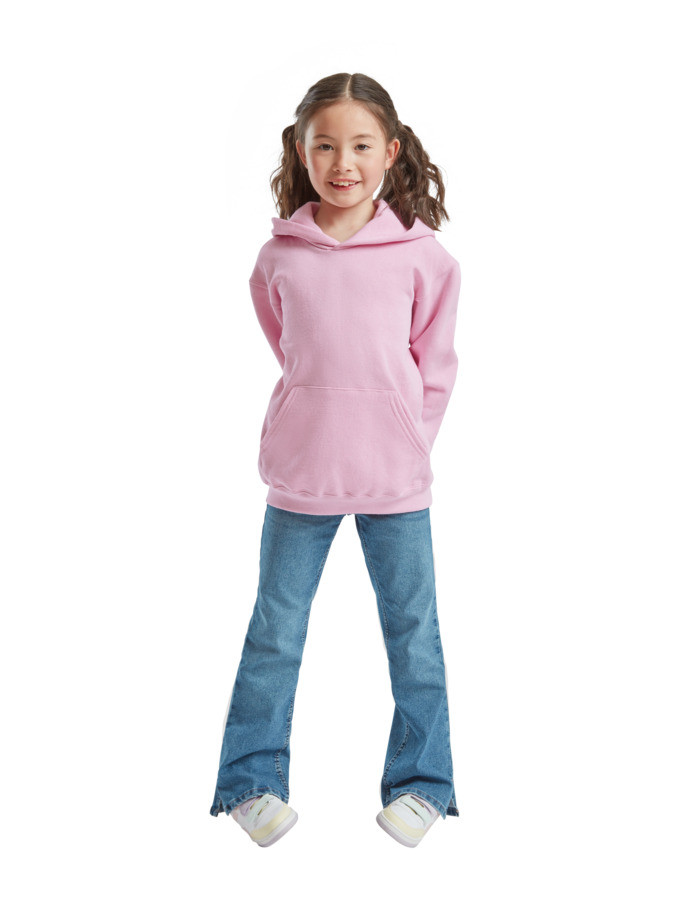 Kapucnis pamut/Lycra® anyagú gyerek pulóver dupla anyagú kapucnival összehúzó nélkül, európai gyerekméretezésnek megfelelő. Első kenguruzseb, bordázott derékrész és ujjvég. Tisztább és tartósabb emblémázhatóság érdekében a gyártó Belcoro® fonalat has