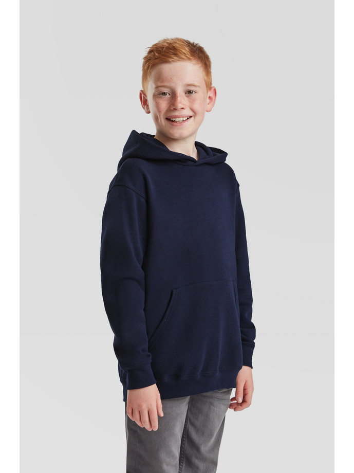 Kapucnis pamut/Lycra® anyagú gyerek pulóver dupla anyagú kapucnival összehúzó nélkül, európai gyerekméretezésnek megfelelő. Első kenguruzseb, bordázott derékrész és ujjvég. Tisztább és tartósabb emblémázhatóság érdekében a gyártó Belcoro® fonalat has