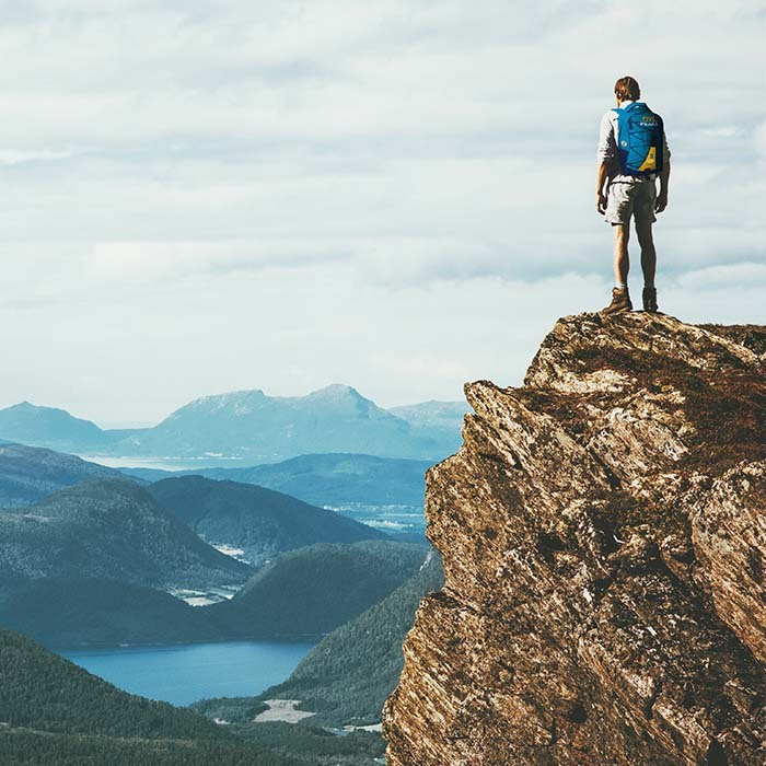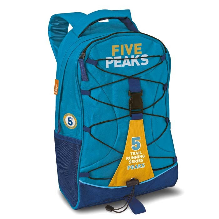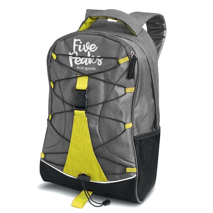Túra hátizsák 600D poliészterből színes kontrasztos betéttel és dekoratív zsinórral az elején. Mindkét oldalán hálós zsebekkel.
