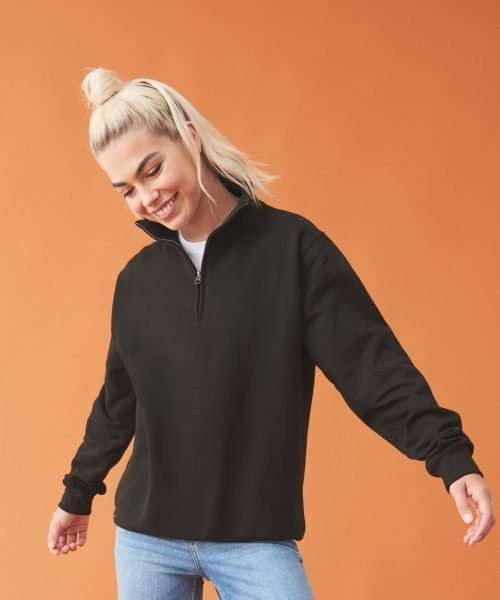 Nyak cipzáras kialakitású pulóver a Just Hoodstól. Fém YKK cipzár, bordás ujjvégek, kitéphető cimke, puha pamut anyag. WRAP tanúsitott gyártás (felelős munkavédelem).