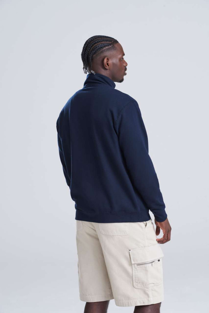 Nyak cipzáras kialakitású pulóver a Just Hoodstól. Fém YKK cipzár, bordás ujjvégek, kitéphető cimke, puha pamut anyag. WRAP tanúsitott gyártás (felelős munkavédelem).