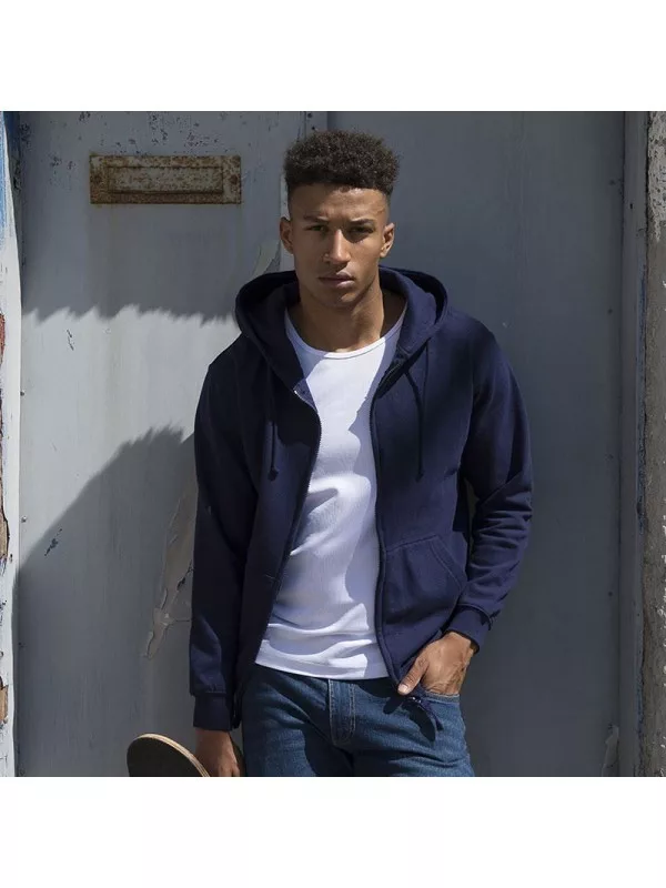 A ZOODIE a Just Hoods legismertebb modellje, felnőtt és gyermek méretben egyaránt rendelhető. 80% pamutból készült, kapucnis és zipzáras tipus, bordás ujjvégekkel és derékrésszel. Két kenguruzsebbel, amelyből a jobb oldaliban rejtett kivágást találunk a fejhallgató kébelnek. Kitéphető cimkés modell, akár saját márkaruházat kialakitására is alkalmas.