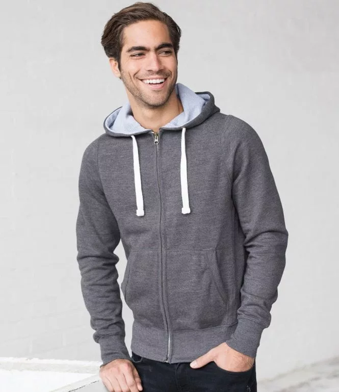 80% Ringspun Cotton/20% Polyester Full-zip hoodie Side panels for stylish fit Brass zip covered with chunky rib detail Overlock stitching detail throughout Double fabric hood with heather grey waffle fabric inner Chunky white flat lace drawcords Kangaroo pouch pocket Deep ribbed cuff and hem Brushed inner fleece Simple tear out label makes it perfect for rebranding Soft cotton faced fabric creates ideal printing surface Worldwide Responsible Accredited Production (WRAP) certified production