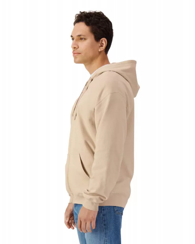 Ez a Gildan pulóver 80%-ban pamutból, 20%-ban poliészterből készült, 285 g/m² súlyú anyagból. Puha, fésült belső bélése és 100%-os gyűrt pamut elülső része ideálissá teszi különféle dekorációs technikákhoz. A pulóver színben passzoló kapucnival, cipzárral, zsebbekkel és elasztikus, spandex keverékű mandzsettákkal rendelkezik. Klasszikus szabású fazon. Újrahasznosított fekete címkével ellátott.
