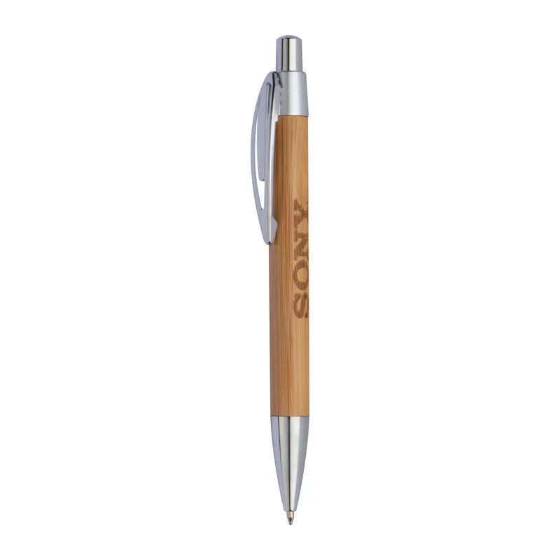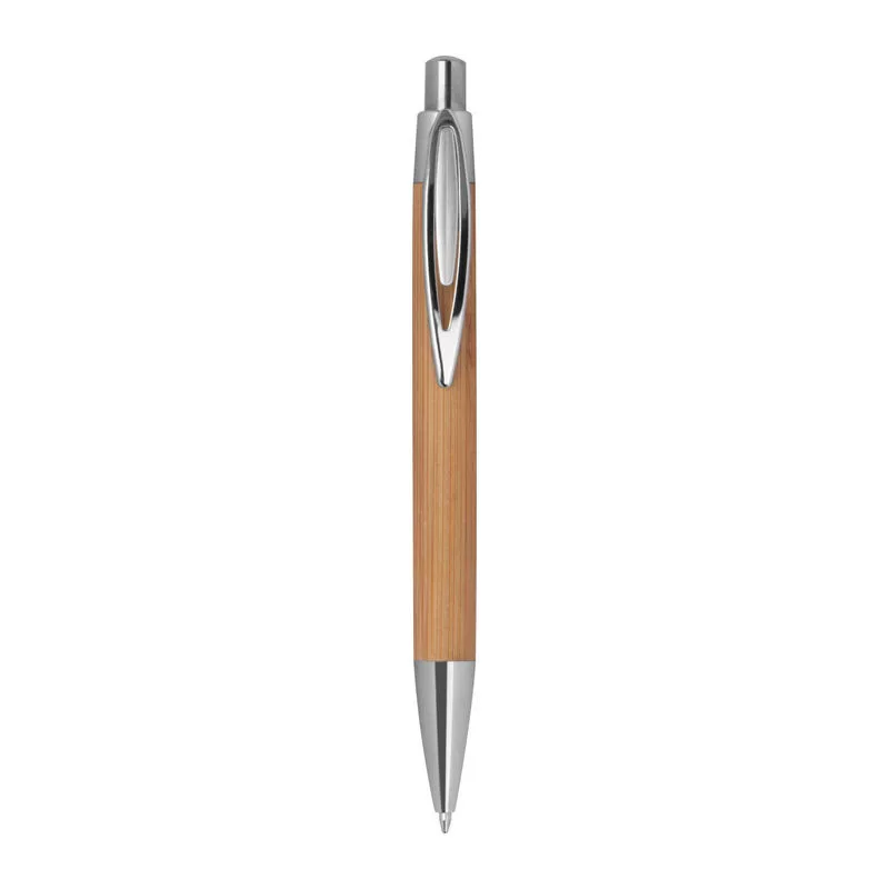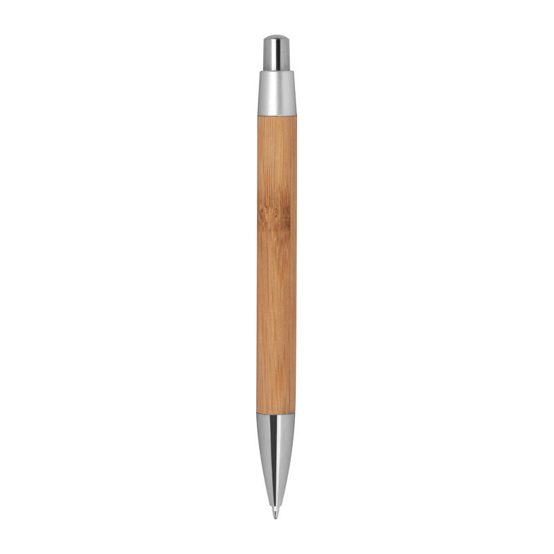 Bambusz golyóstoll ezüst kiegészítőkkel, kéken író betéttel és extravagáns hegyes klipsszel.