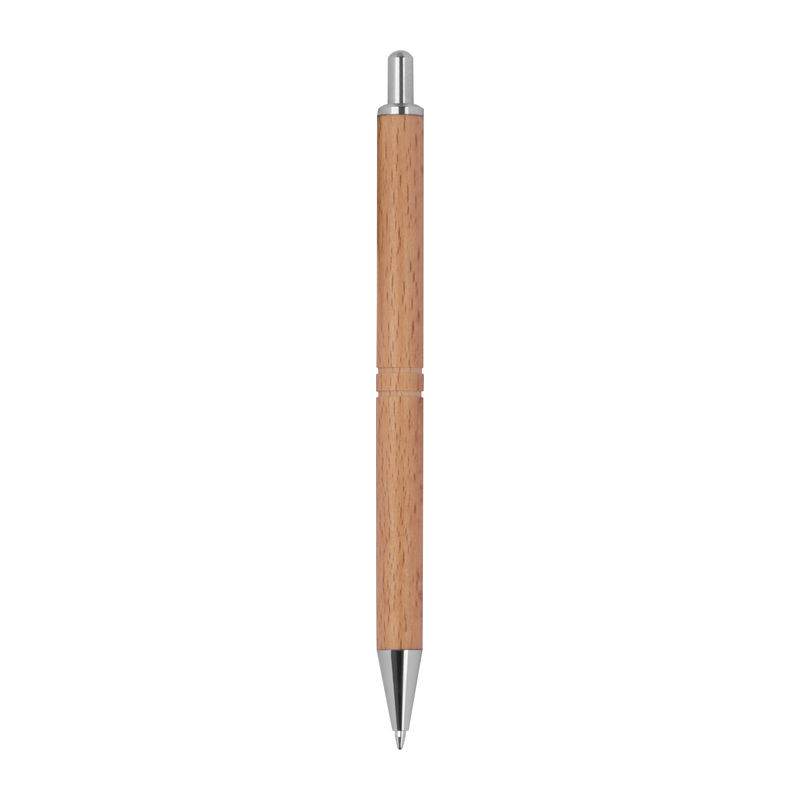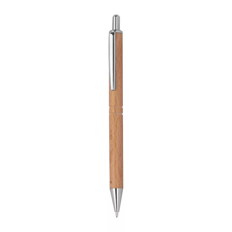 Fából készült golyóstoll kék tollbetéttel, ezüst klipsszel és bevágással a tollteseten.