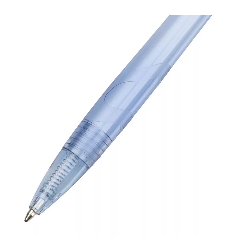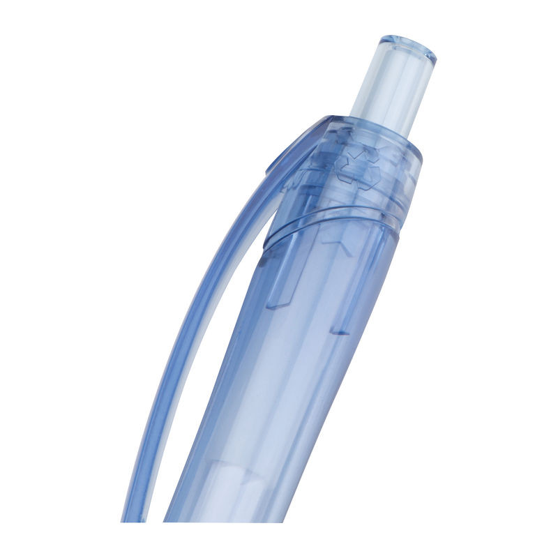 Környezetbarát, átlátszó golyóstoll RPET-ből, nagy kék tollbetéttel, ívelt klipsszel, enyhén eltolt markolatzónával és RPET logóval.