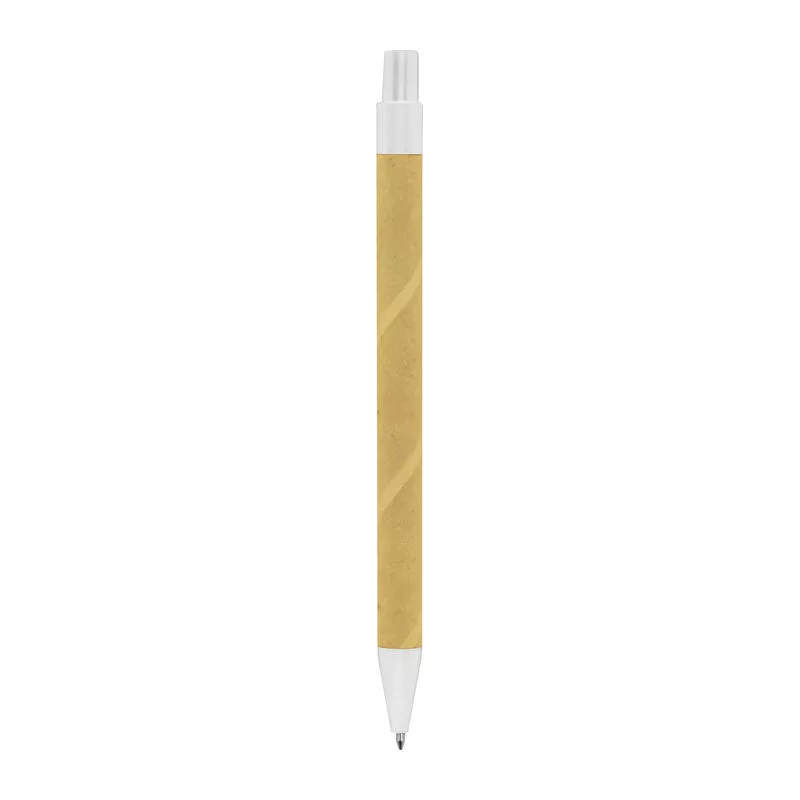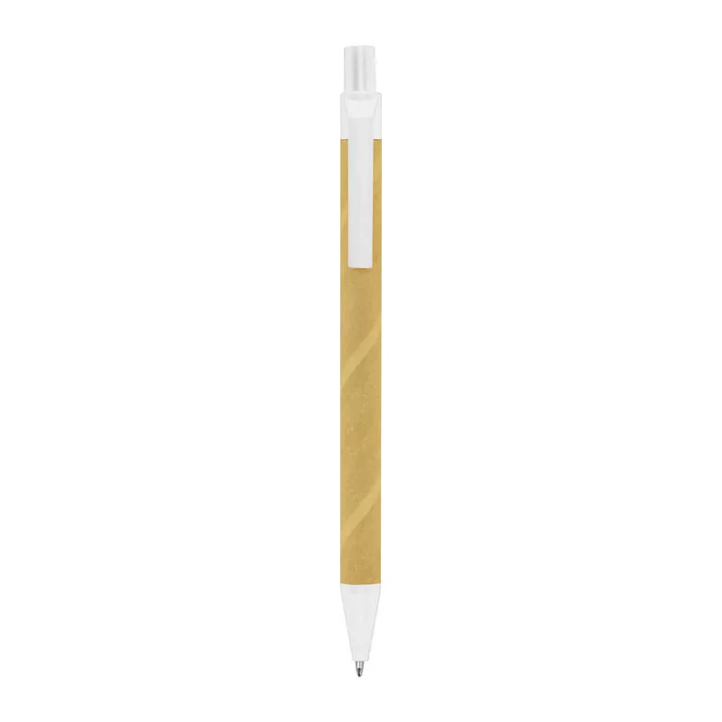 Környezetbarát, kéken író golyóstoll újrahasznosított papírból. A színes kiegészítők kukoricából készültek.