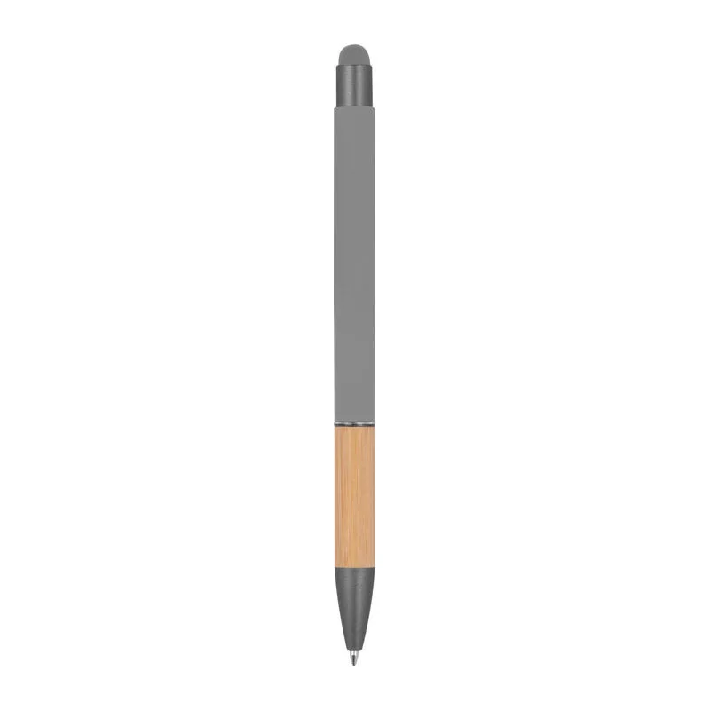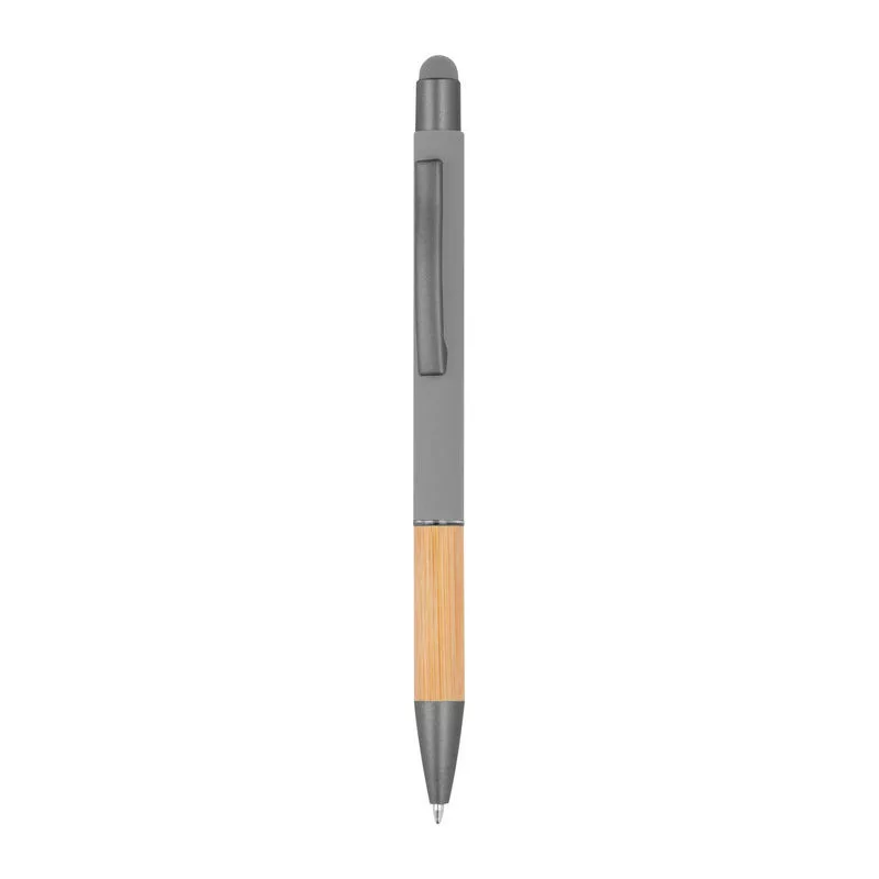 Alumínium toll, kéken író tollbetéttel, érintőképernyős funkcióval, matt, ezüst felületekkel és bambusz markolattal.