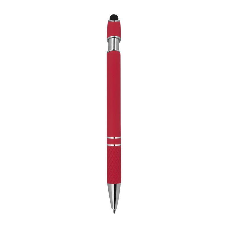 Fém gumírozott golyóstoll, ezüst színű kiegészítőkkel, mintázott markolattal, érintőfunkcióval, kék színű betéttel és 2 díszítő gyűrűvel.