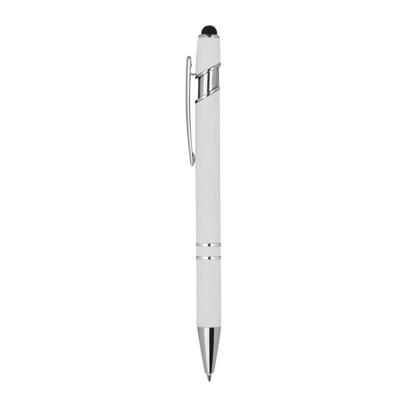 Fém gumírozott golyóstoll, ezüst színű kiegészítőkkel, mintázott markolattal, érintőfunkcióval, kék színű betéttel és 2 díszítő gyűrűvel.