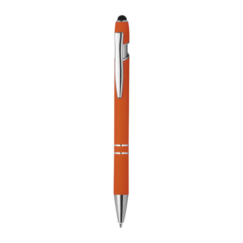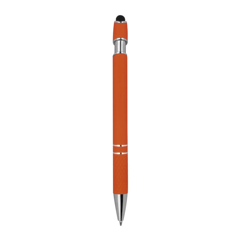Fém gumírozott golyóstoll, ezüst színű kiegészítőkkel, mintázott markolattal, érintőfunkcióval, kék színű betéttel és 2 díszítő gyűrűvel.