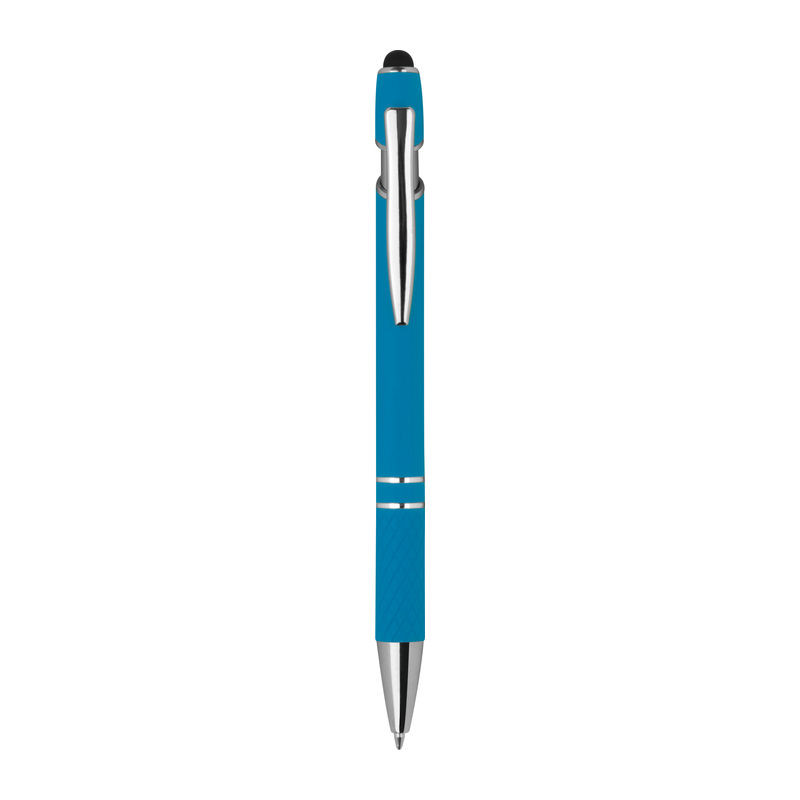 Fém gumírozott golyóstoll, ezüst színű kiegészítőkkel, mintázott markolattal, érintőfunkcióval, kék színű betéttel és 2 díszítő gyűrűvel.