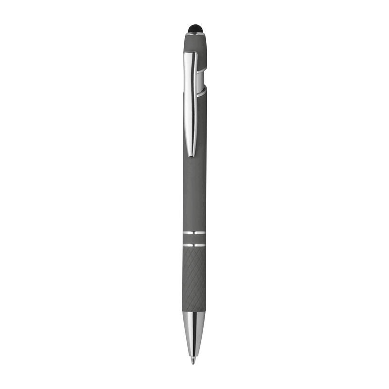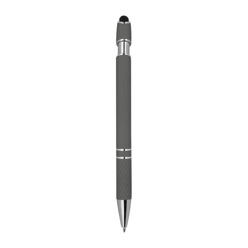 Fém gumírozott golyóstoll, ezüst színű kiegészítőkkel, mintázott markolattal, érintőfunkcióval, kék színű betéttel és 2 díszítő gyűrűvel.