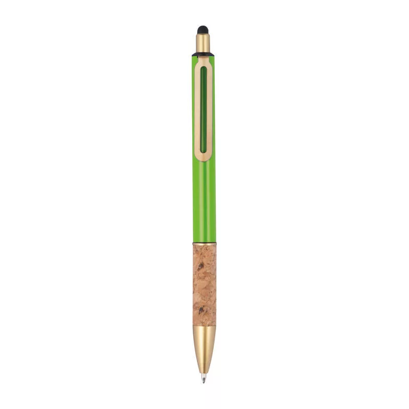 Fém érintőképernyős golyóstoll aranyszínű kiegészítőkkel, kék színű tollbetéttel és parafa markolattal.
