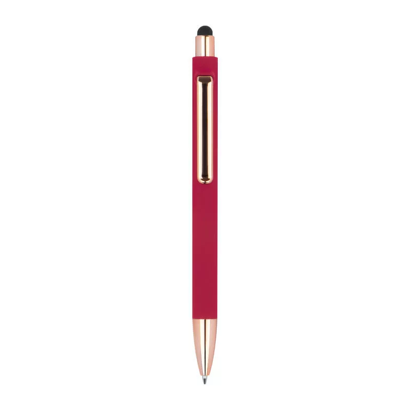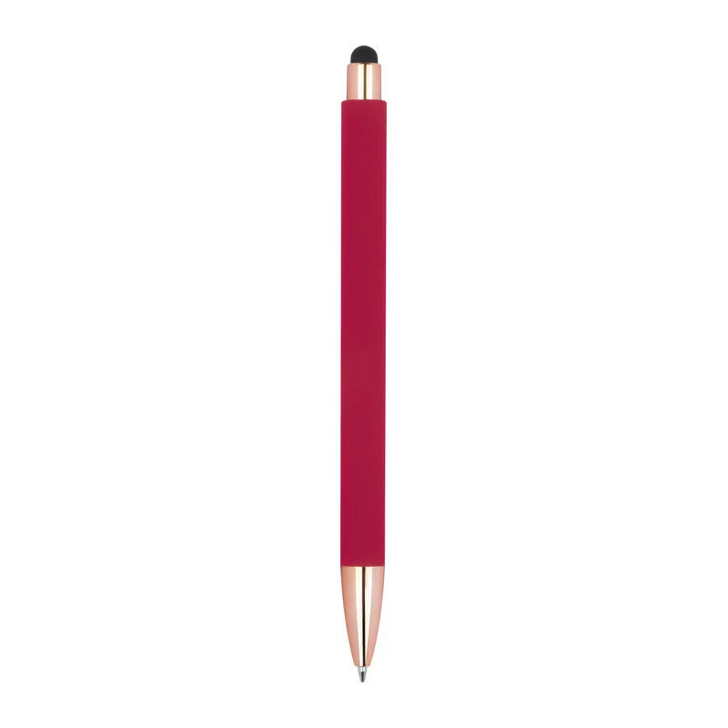 Gumírozott toll rózsaarany (rosegold) színű kiegészítőkkel, kéken író tollbetéttel, extravagáns klipsszel és érintő funkcióval.