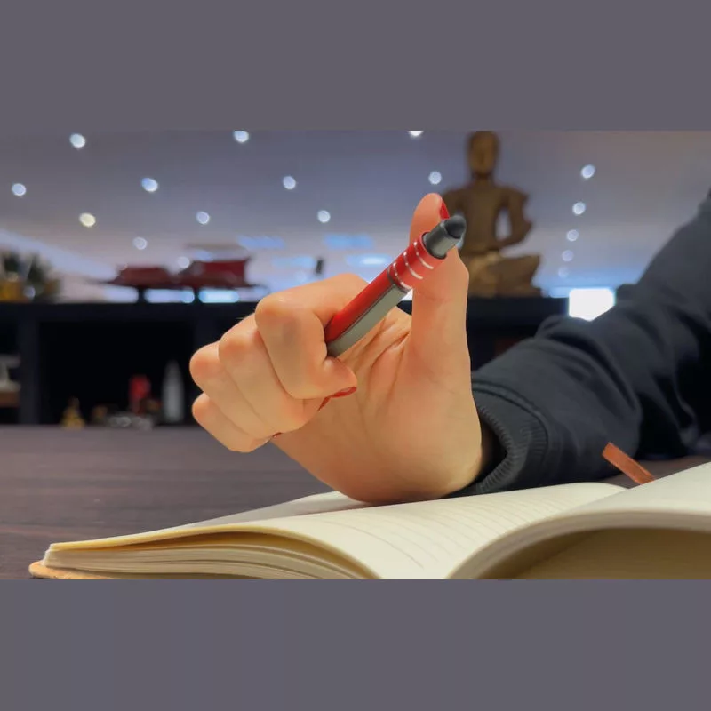 Alumíniumból készült golyóstoll kéken író tollbetéttel, érintés funkcióval és forgatható résszel. Kattintás helyett forgassa a fidgetet!