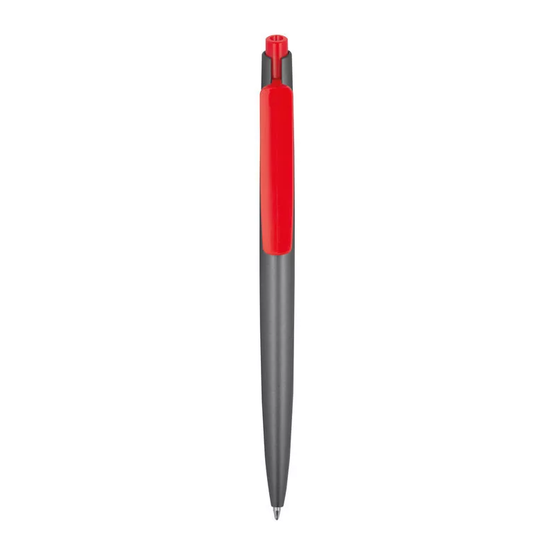 Nyomógombos golyóstoll újrahasznosított ABS-ből, színes díszítésekkel és kék színű, jumbo tollbetéttel.