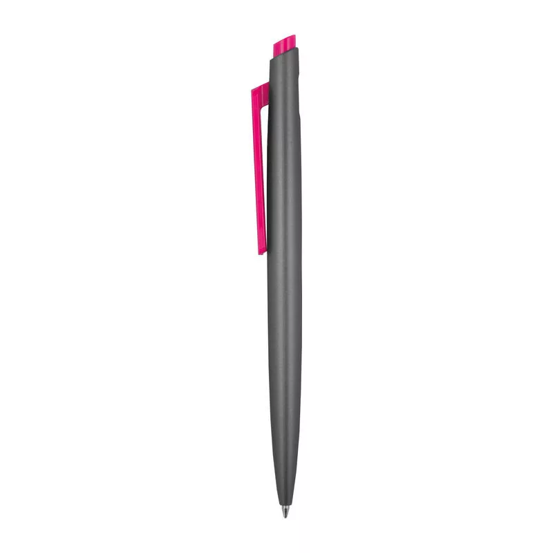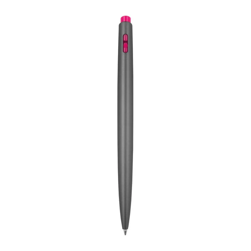 Nyomógombos golyóstoll újrahasznosított ABS-ből, színes díszítésekkel és kék színű, jumbo tollbetéttel.