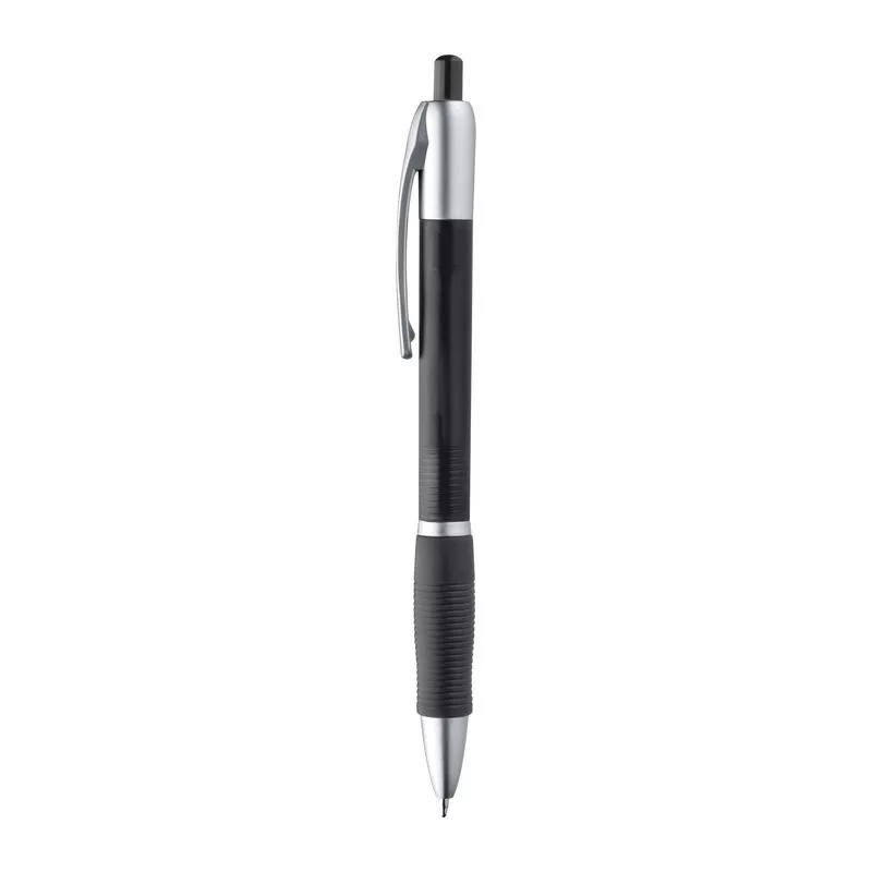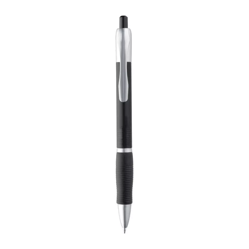 Műanyag golyóstoll, nyomó mechanizmussal, kéken író tollbetéttel és puha bordázott gumi markolattal.