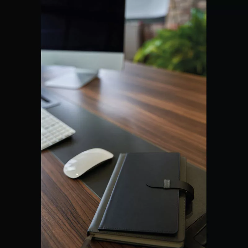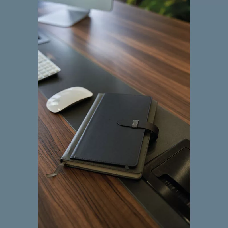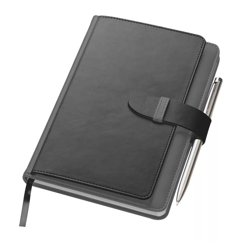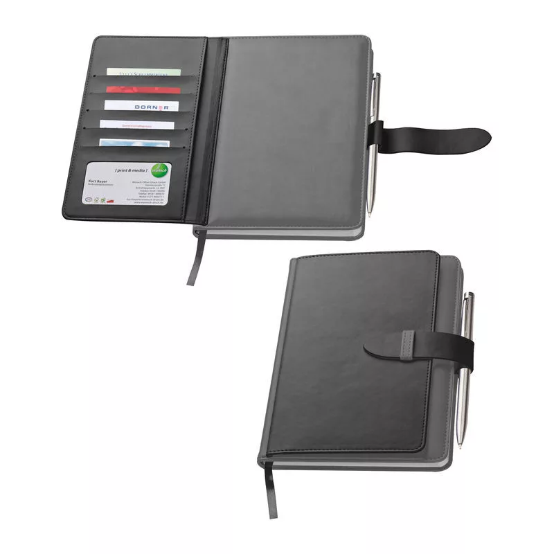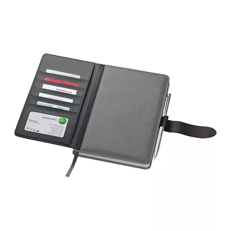 A5 méretű prémium notesz PU borítóval, 256 vonalas oldallal, tolltartó pánttal és kártyatartó zsebbekkel.
