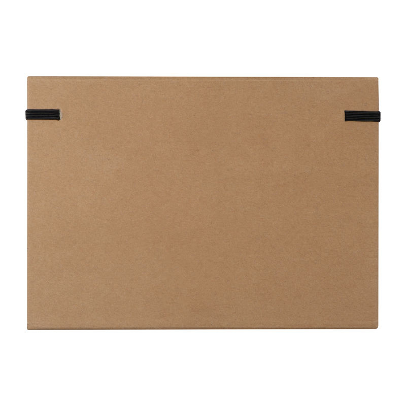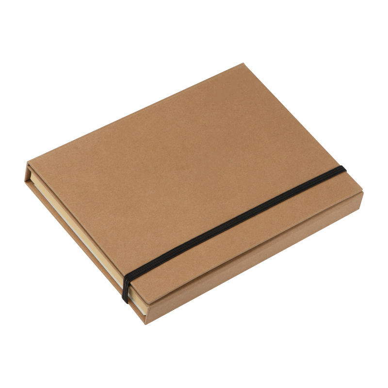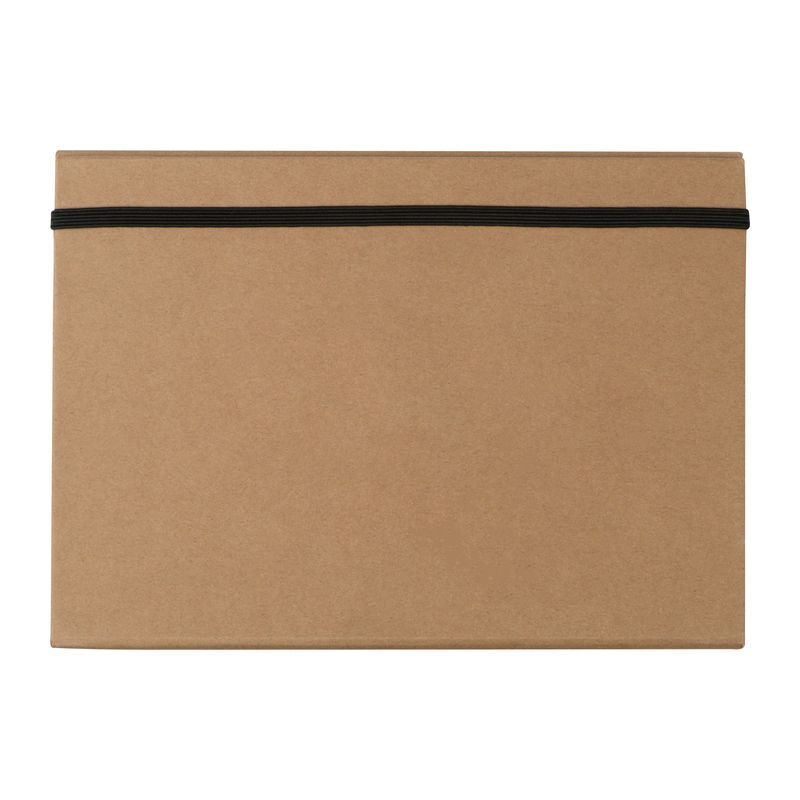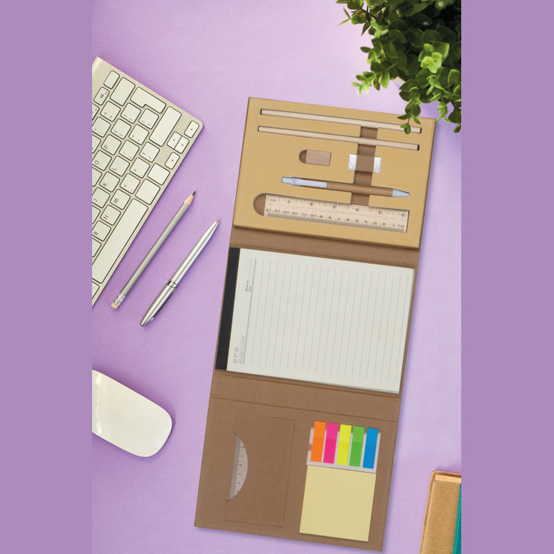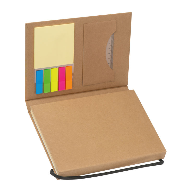 Kihajtható karton mappa A5 méretben, gumipánttal záródik. Tartalma egy 80 vonalas oldalas jegyzettömb, 25 db jelölőcsík 5 különböző színben, jegyzet lapocskák, két vonalzó, egy golyóstoll, hegyező, radír és 2 db ceruza.