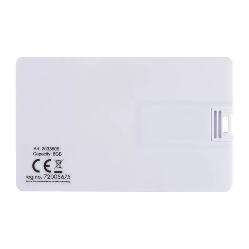 USB card with 4GB storage capacity. Thanks to its flat shape it can be easily stowed anywhere. The large white area is perfect for digital print. Deliveries within Germany are subject to GEMA fees.