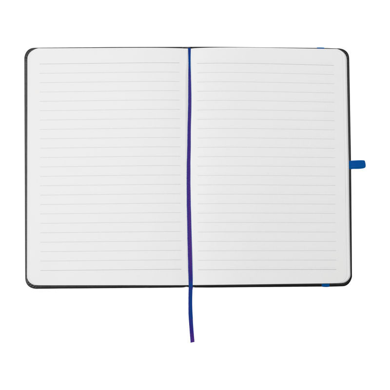 A5 méretű jegyzetfüzet PU borítóval, 192 vonalas oldallal, színes könyvjelzővel, tolltartó hurokkal és gumiszalaggal. A gravírozás színe megegyezik a gumiszalagéval.