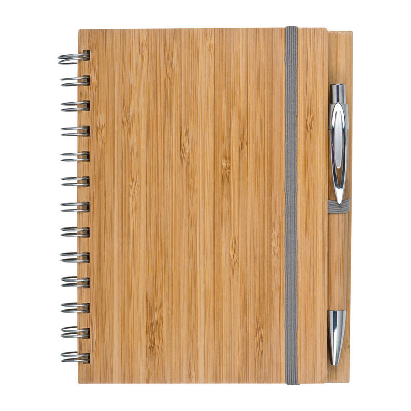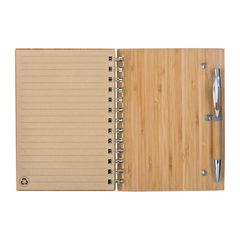 Trendi notesz igazi bambuszból készült borítóval, kéken író golyóstollal, amely ugyancsak bambuszból készült. A jegyzettömb 140 újrahasznosított papírból készült vonalas oldalt tartalmaz (70 lap, 70g/m²).