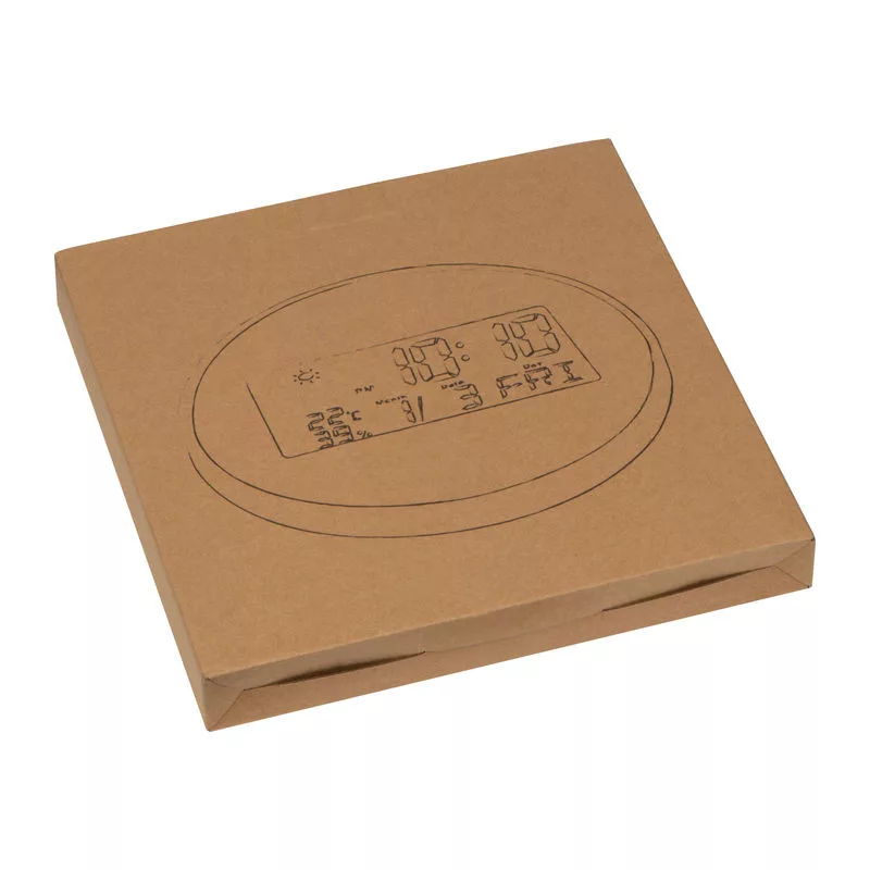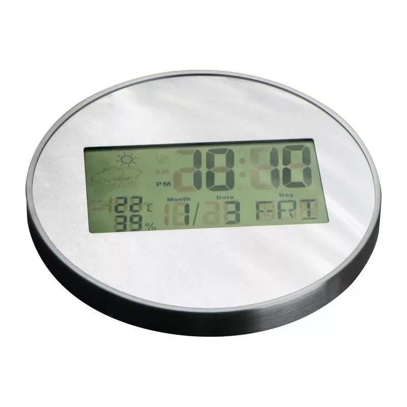 Modern falióra digitális kijelzővel. Az óra mutatja az időt, a hőmérsékletet, a páratartalmat, a dátumot és a hét napját. Az elemet tartalmazza.