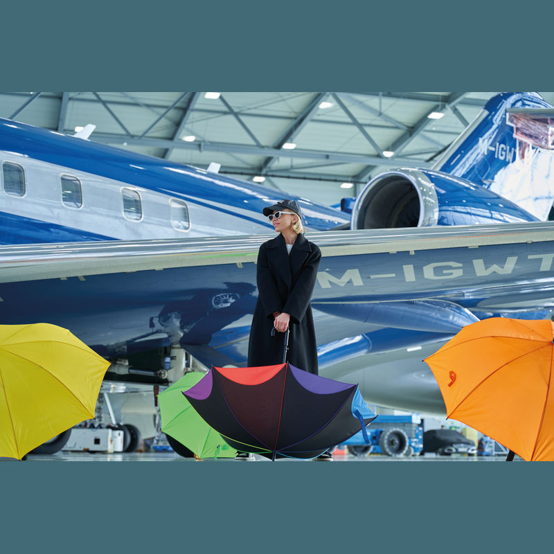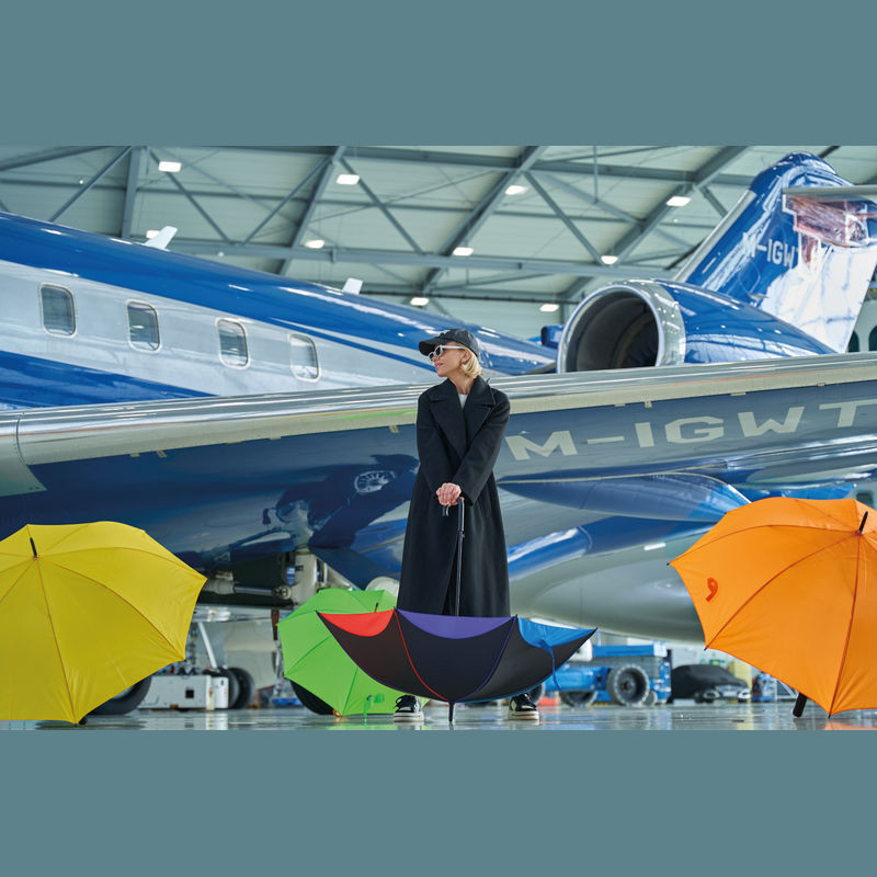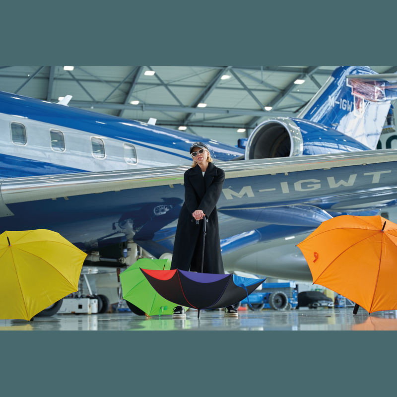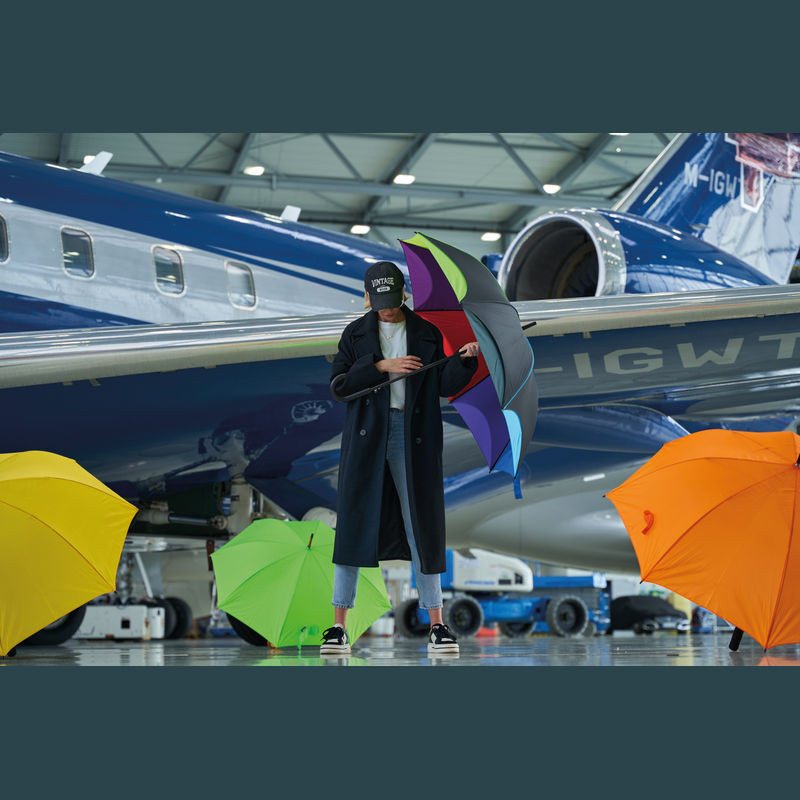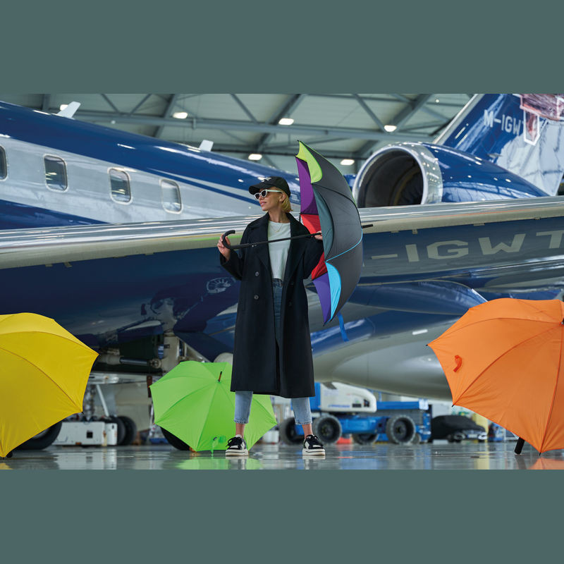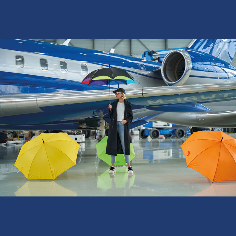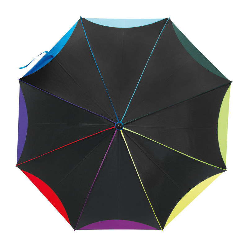 Poliészterből készült XXL méretű automata nyitású esernyő szivárvány színben, műanyag fogantyúval, műanyag hegyekkel és fekete vázzal, UV védelemmel.