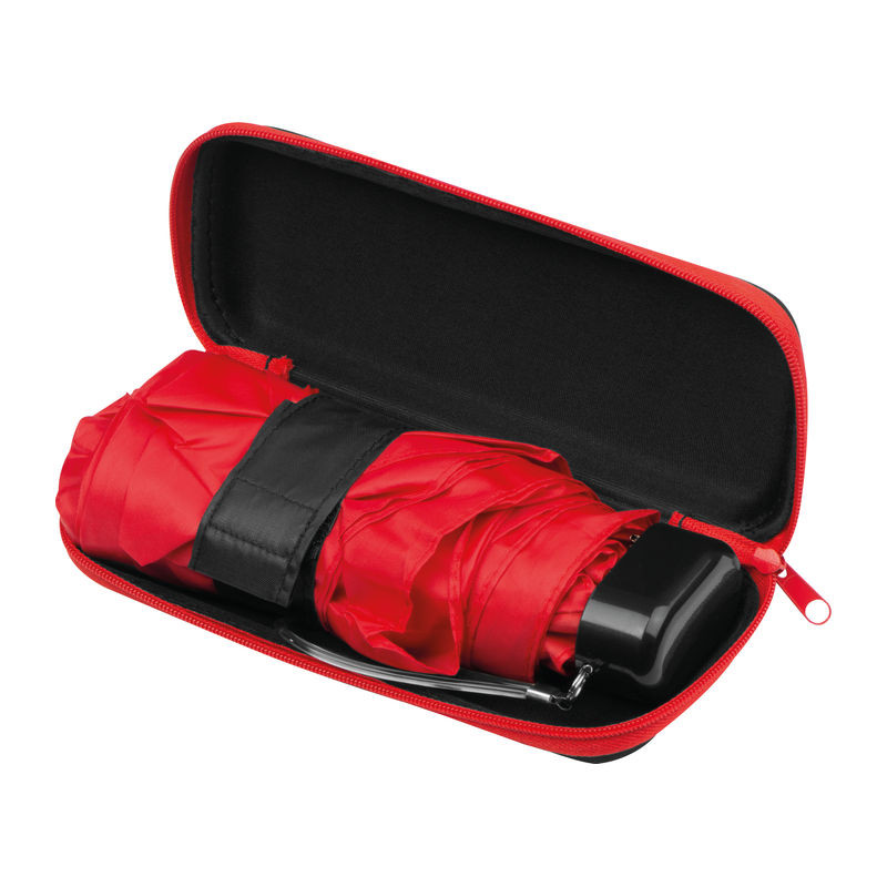 Mini összecsukható esernyő 190T poliészterből, cipzáras EVA tokban a könnyebb szállításért.