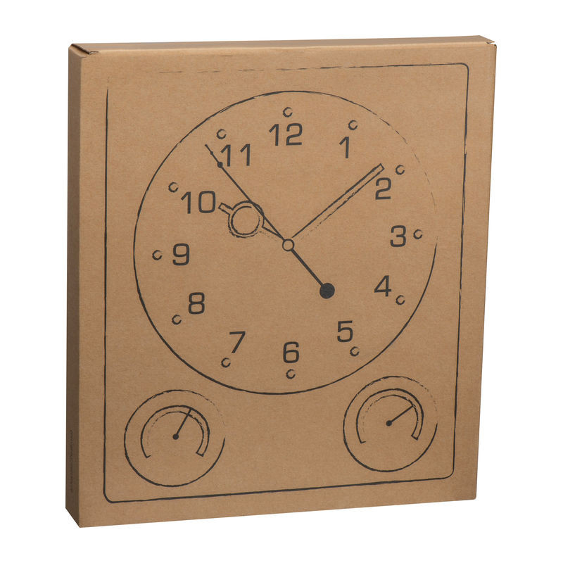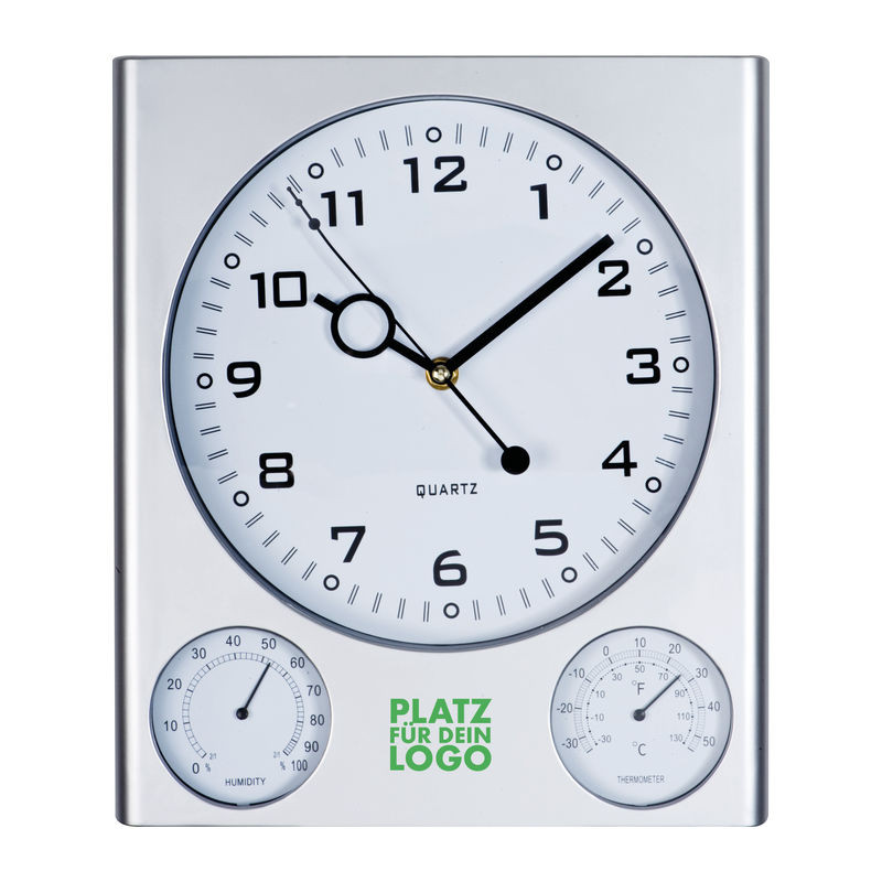 Műanyag falióra hőmérővel és higrométerrel, elegáns szögletes dizájnnal.