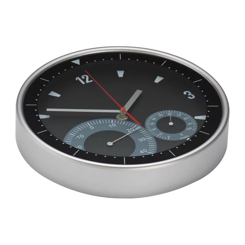 Modern falióra higro- és termométerrel. Az emblémázás kizárólag az óra műanyag előlapján és nem a számlapon /belül/ történik.