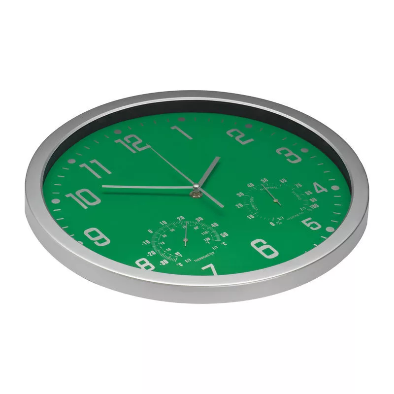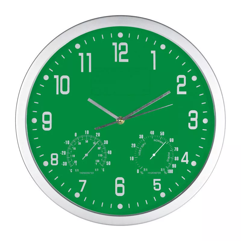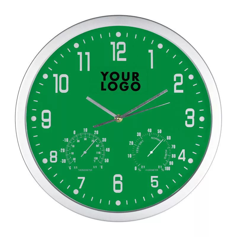 Elegáns és egyszerű - ezáltal ideális reklámhordozó ez a falióra hőmérővel és higrométerrel.