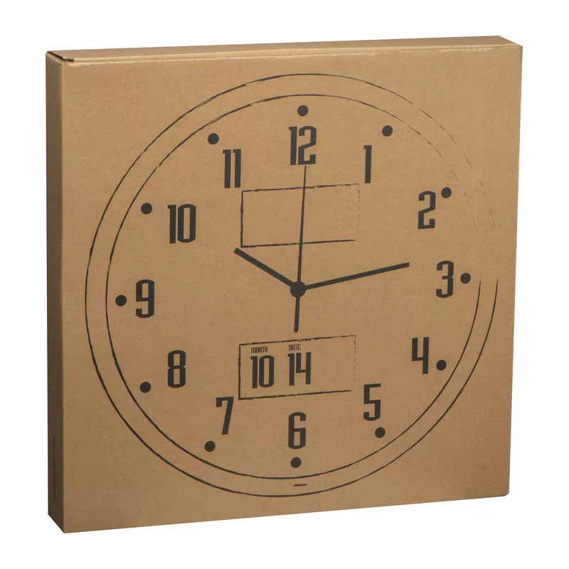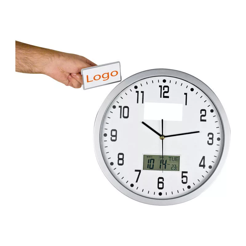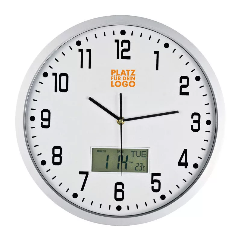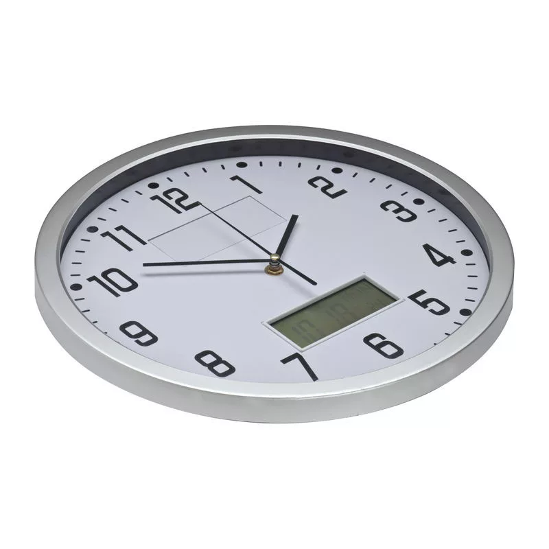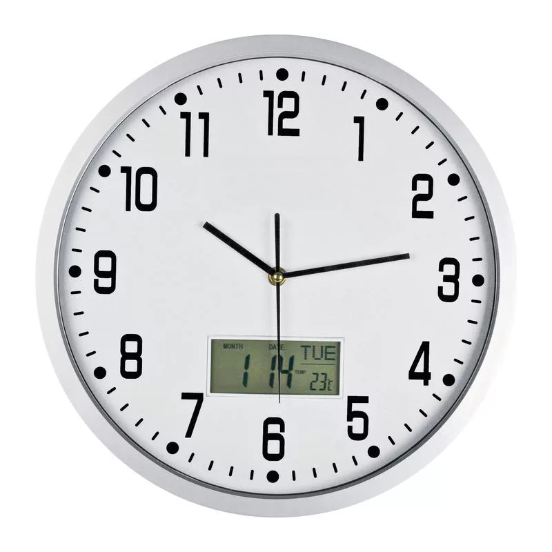 Analóg falióra nagy digitális dátum, napok és hőmérséklet kijelzővel. Egy pillantás az órára és minden információ meg van.