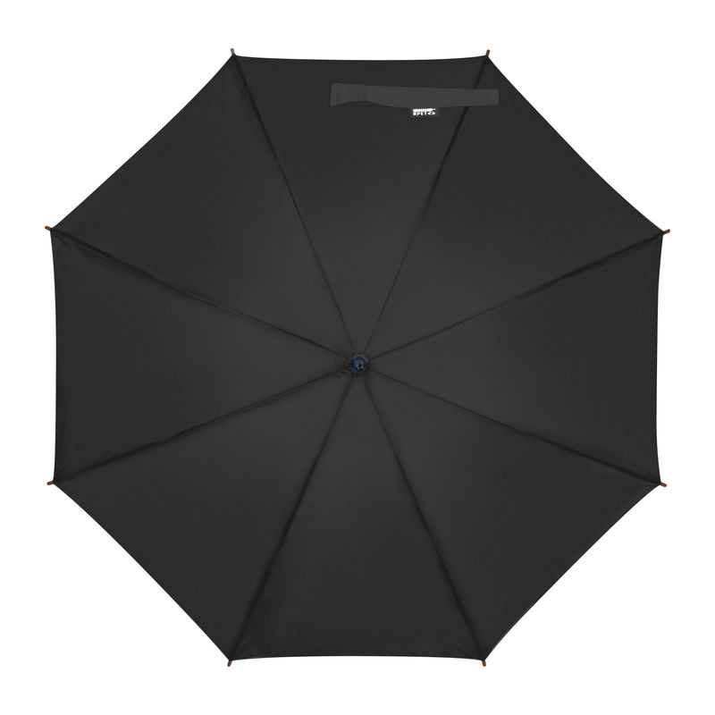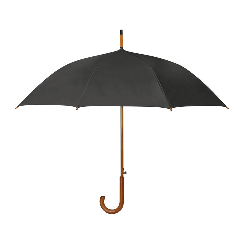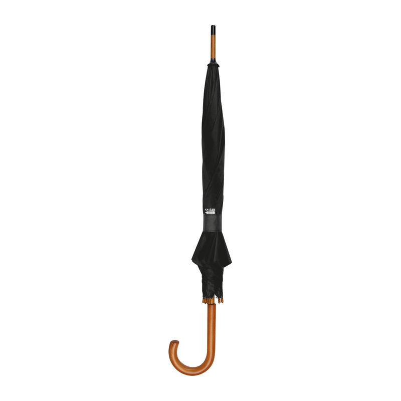 Kiváló minőségű automata nyitású esernyő újrahasznosított PET anyagból és ívelt fa fogantyúval.