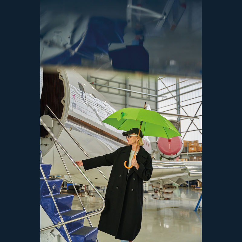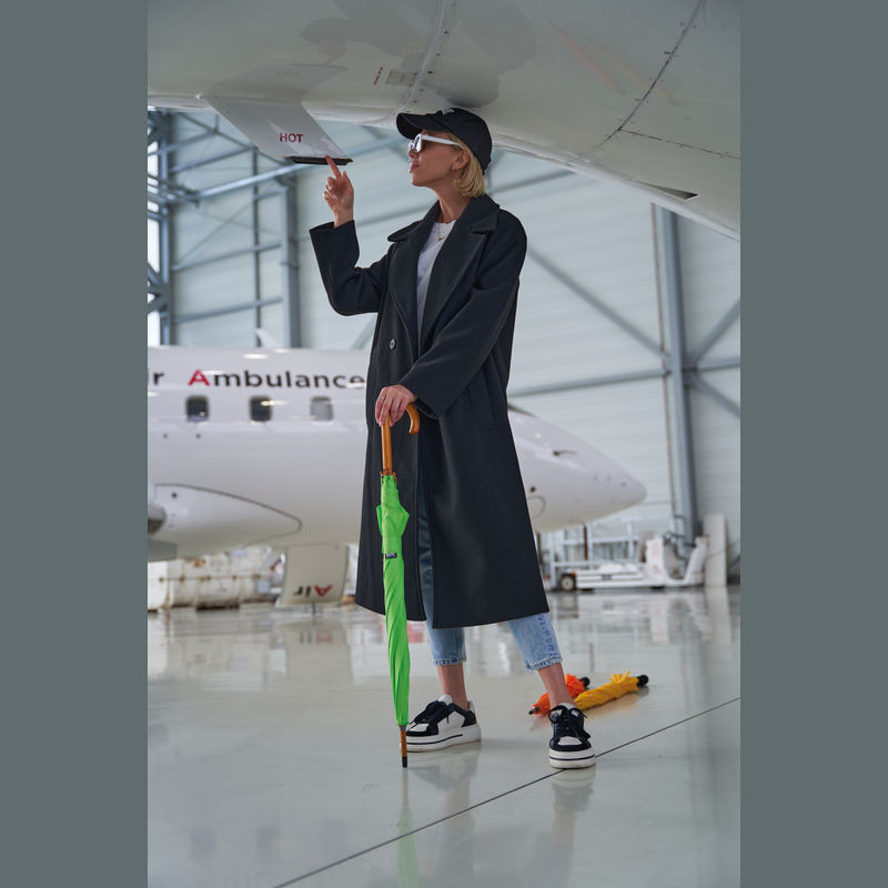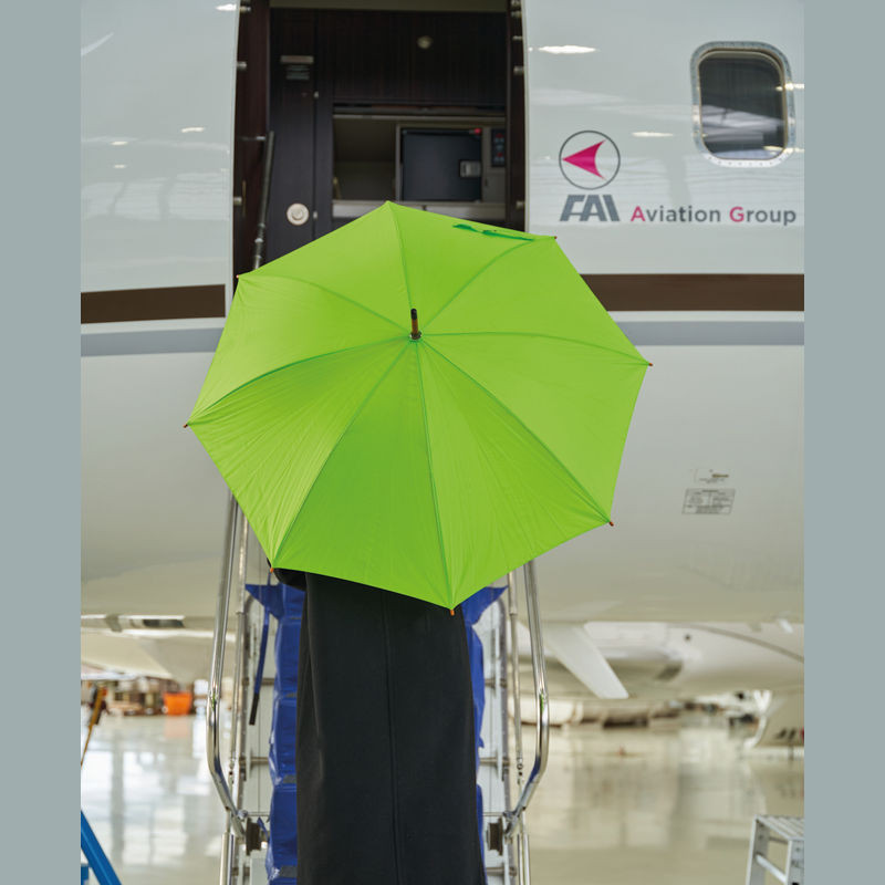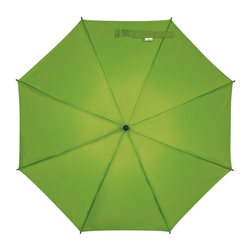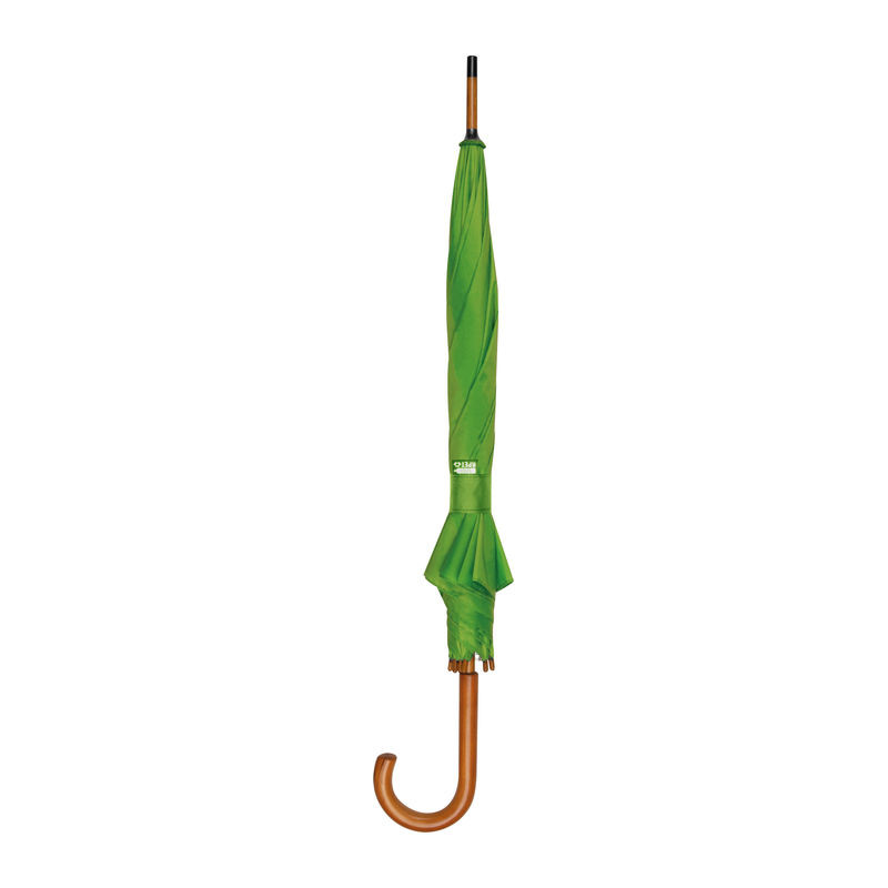 Kiváló minőségű automata nyitású esernyő újrahasznosított PET anyagból és ívelt fa fogantyúval.