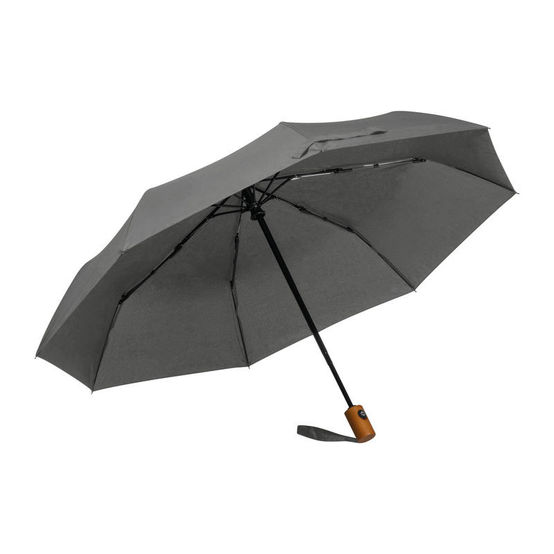 Automata nyitható és összecsukható esernyő üvegszálas kerettel, újrahasznosított PET palackokból készült huzattal, fa fogantyúval és csuklópánttal.