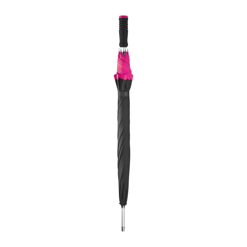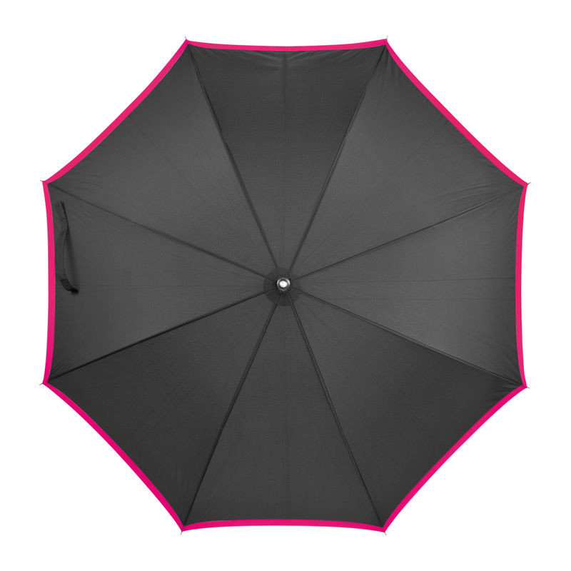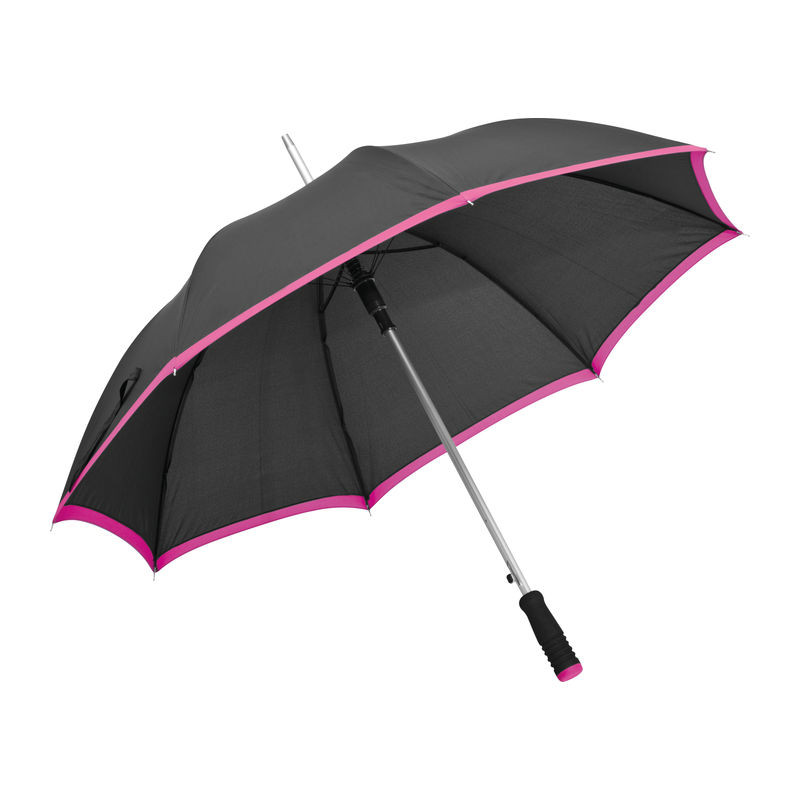 Elegáns automata nyitású esernyő selyem anyagból, kényelmes puha markolattal. A panelek vége és a markolat alja divatos színnel kiemelve.