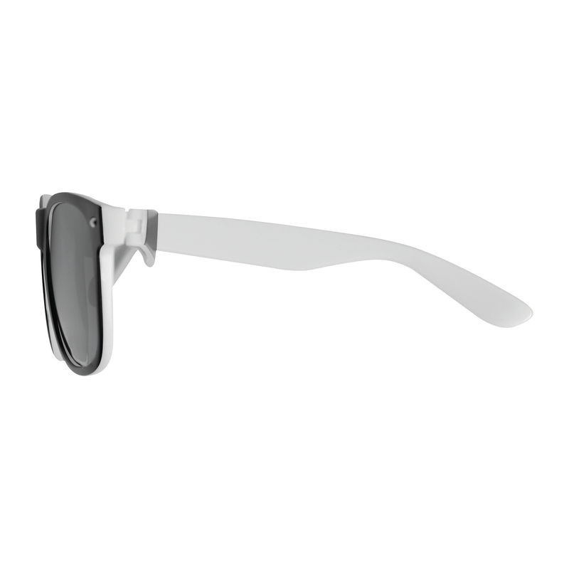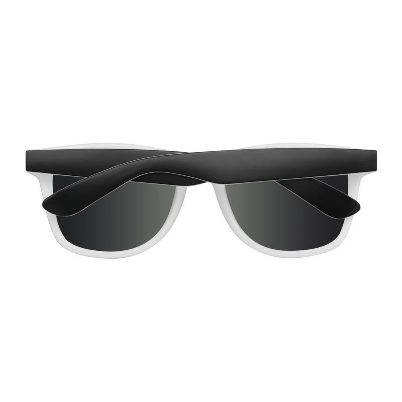 Stílusos műanyag napszemüveg, kétszínű kerettel és tükröződő lencsékkel, UV400 szűrővel, 3-as kategóriájú védelemmel.