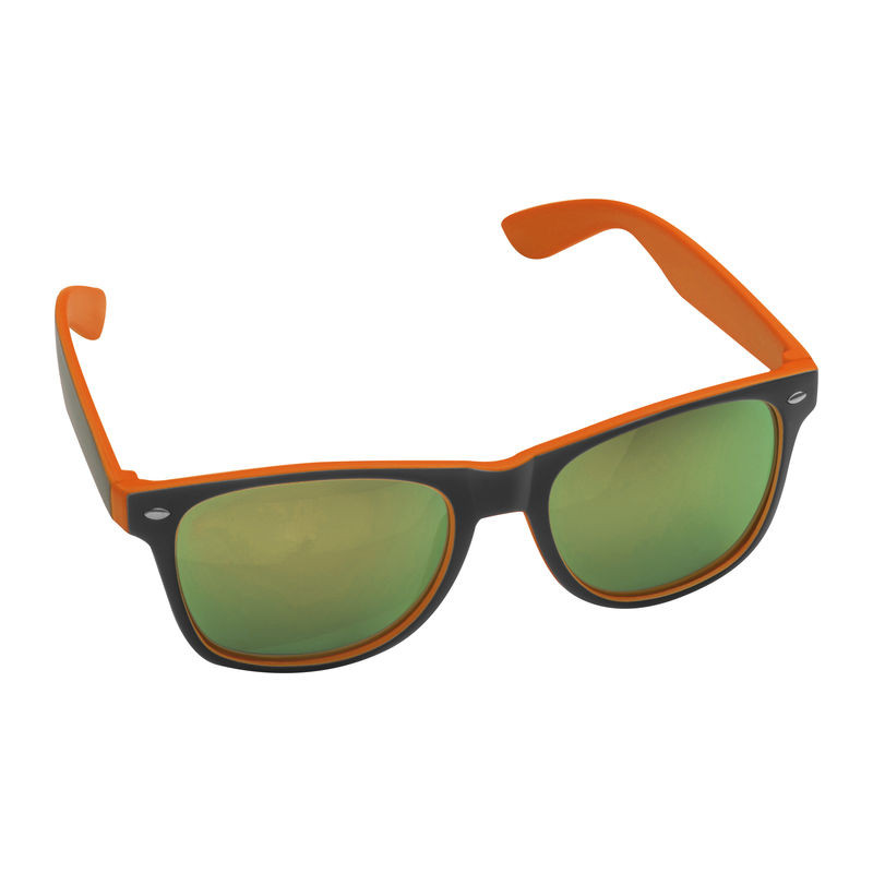 Stílusos műanyag napszemüveg, kétszínű kerettel és tükröződő lencsékkel, UV400 szűrővel, 3-as kategóriájú védelemmel.
