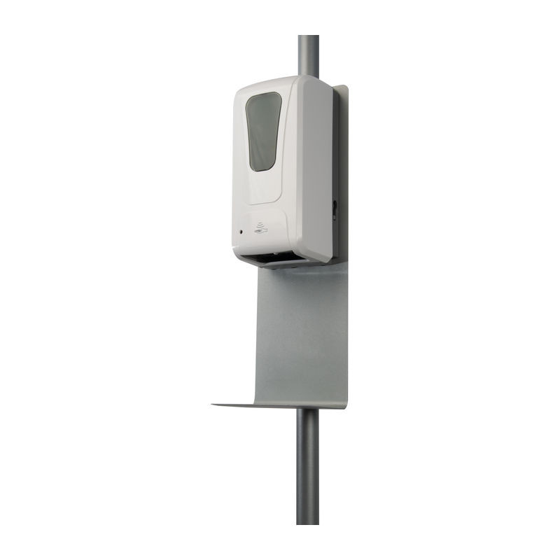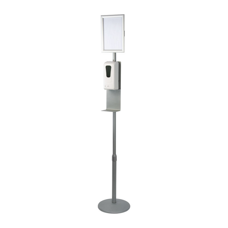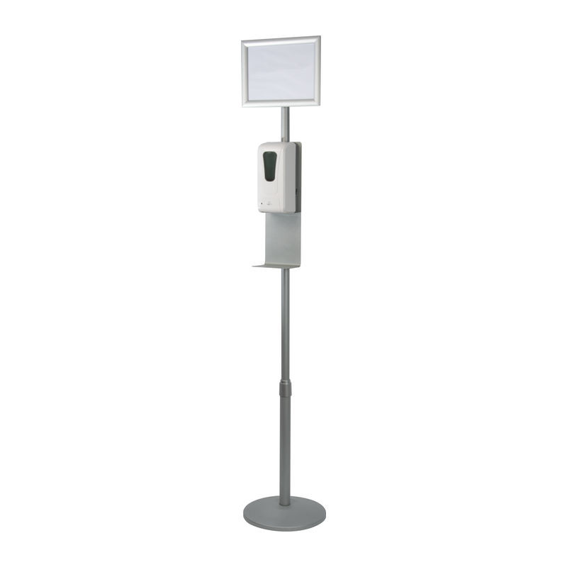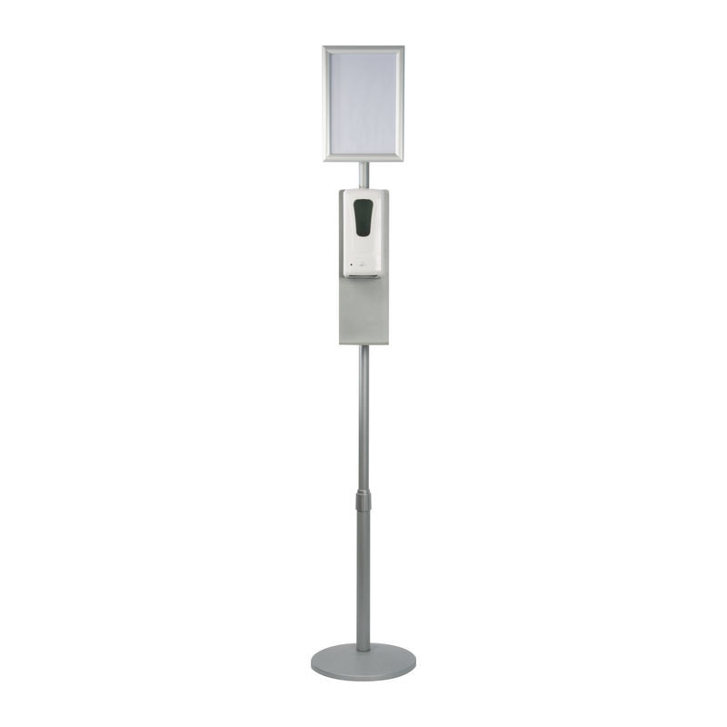 Szenzoros fertőtlenítő oszlop, állítható magassággal (125-165 cm), A4-es reklámfelülettel, 1L fertőtlenítő gél vagy folyadék számára. DC adapterrel (6V/1A) vagy 4db 1,5V-os C tipusú (kisgóliát) elemmel működik, ami nem tartozéka a terméknek.